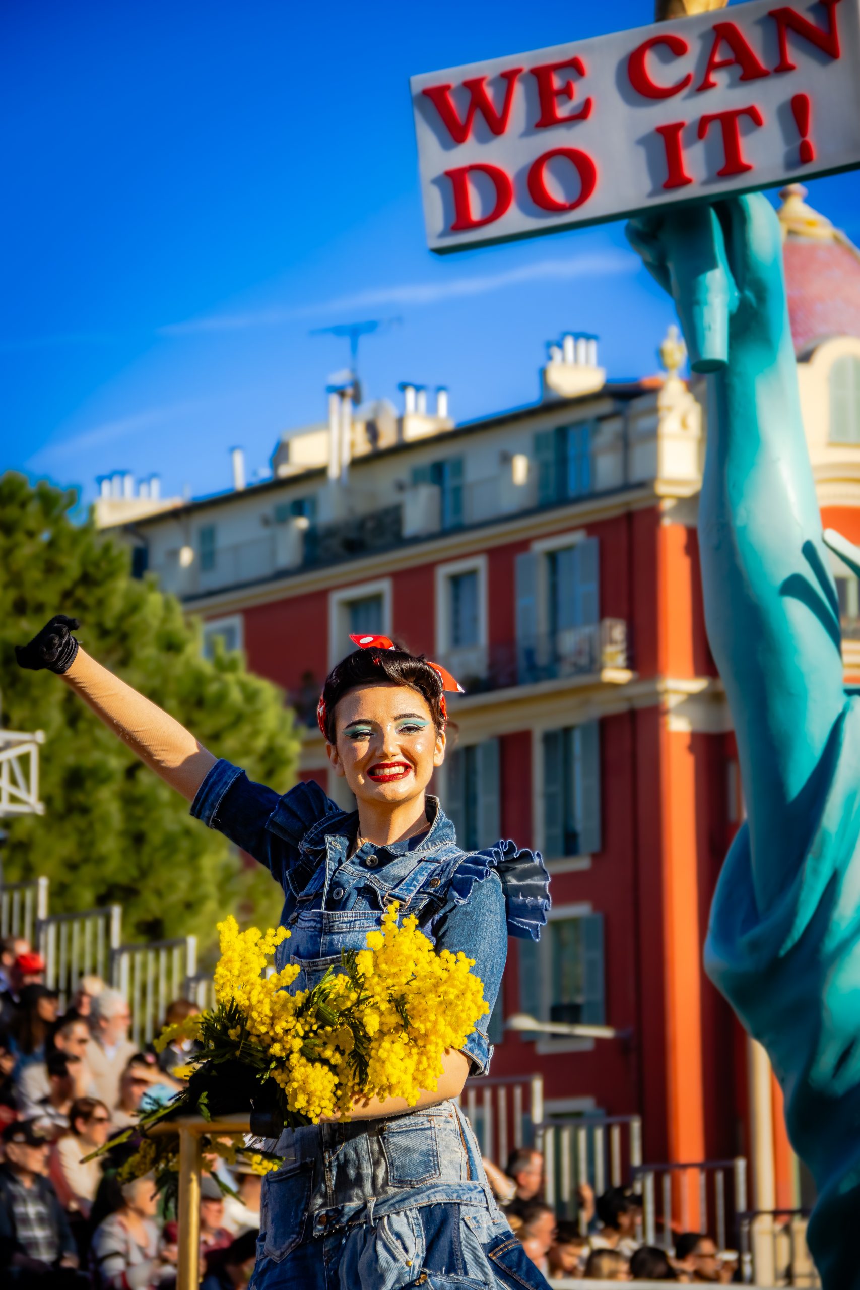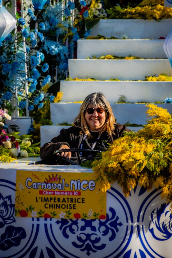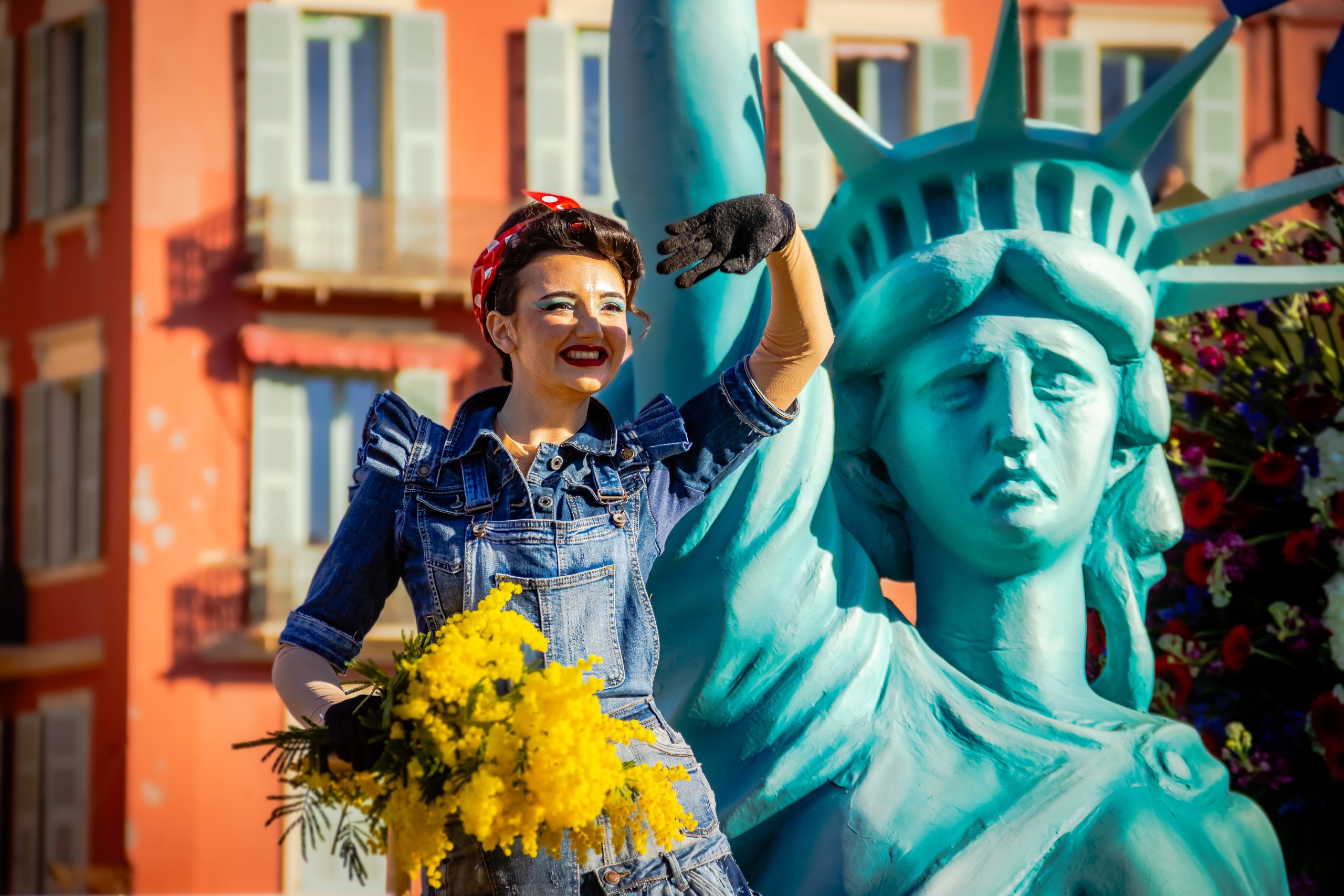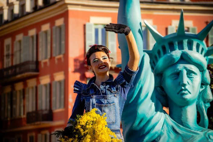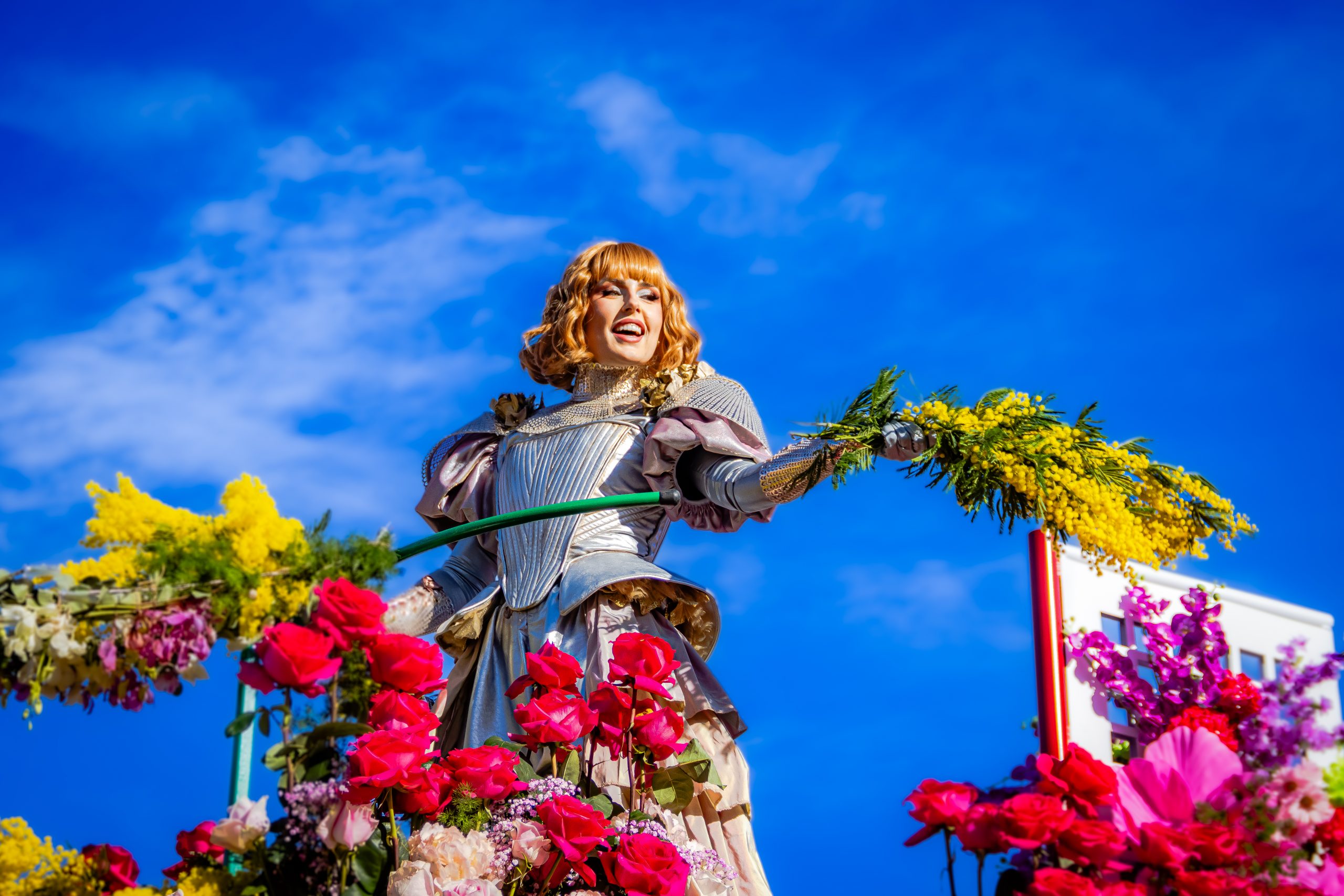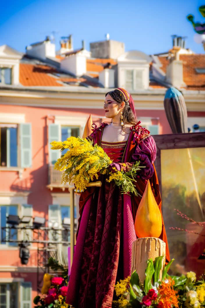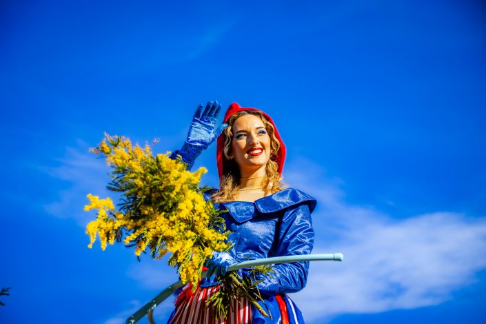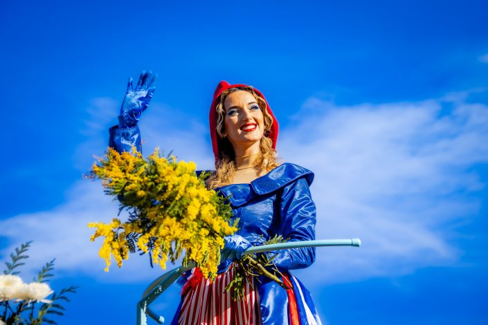 14 comédiennes distribuent au public plus de 4 tonnes de mimosas par sortie, en plus des fleurs décorant les chars.