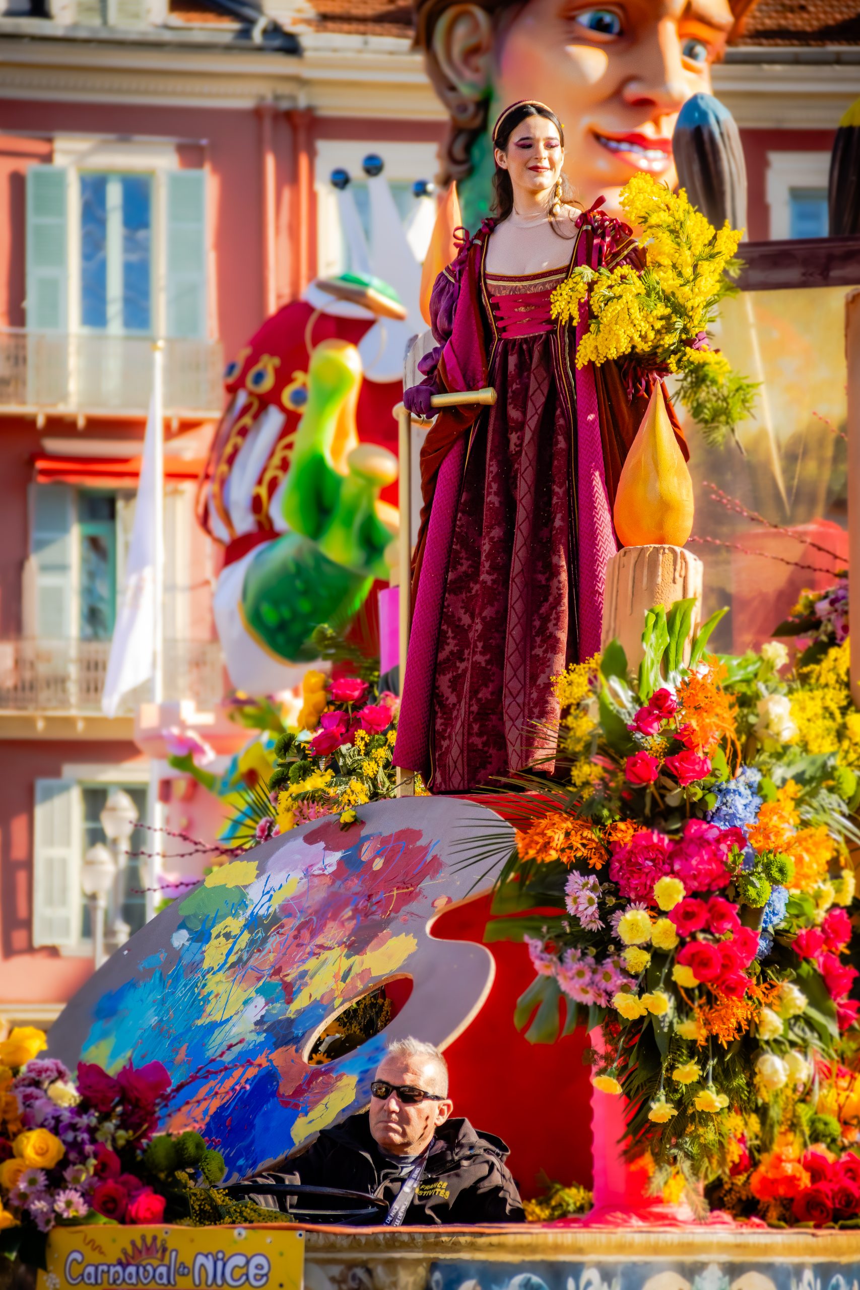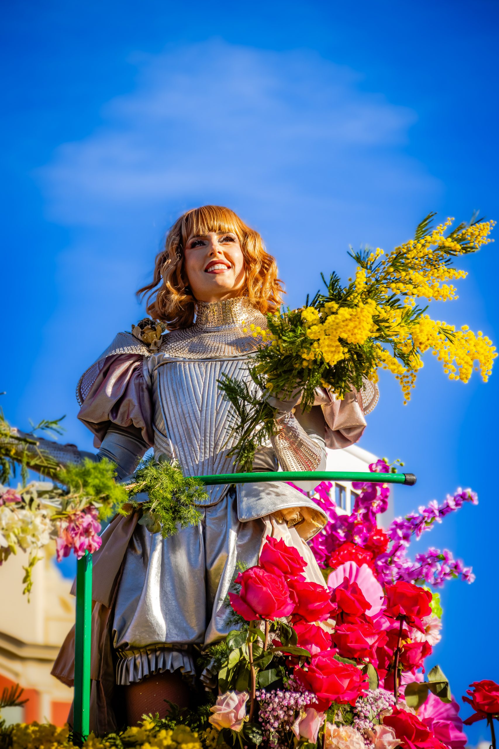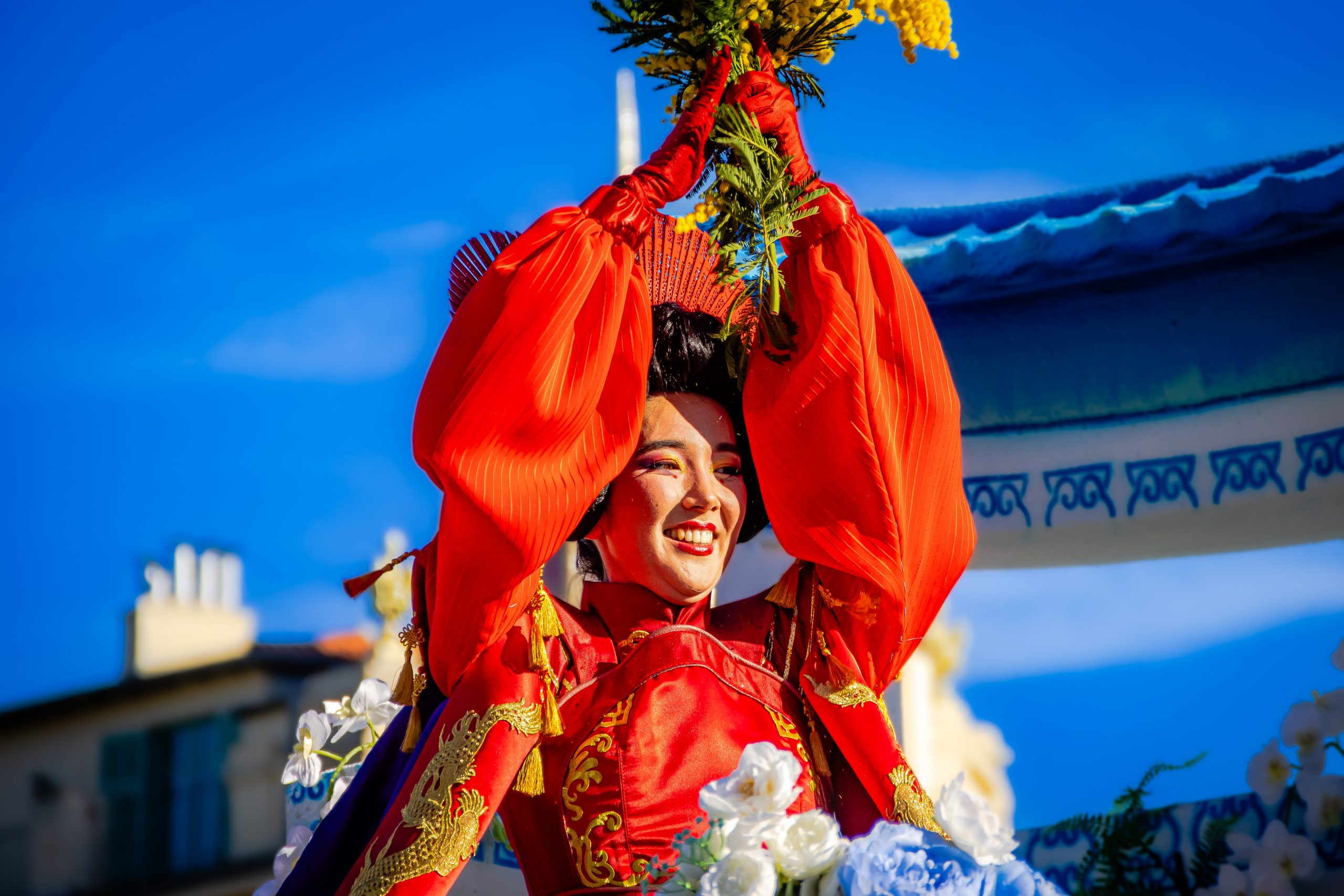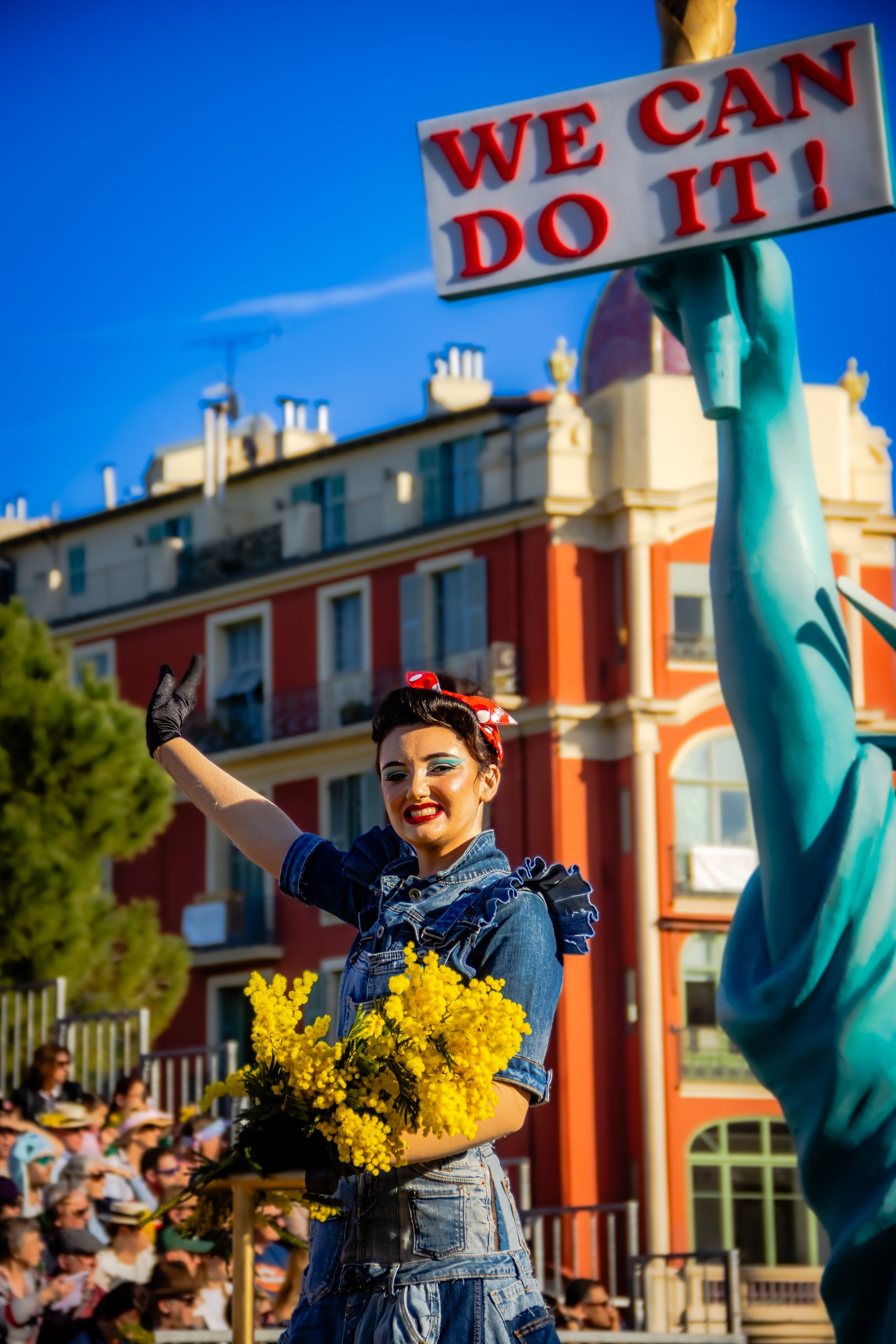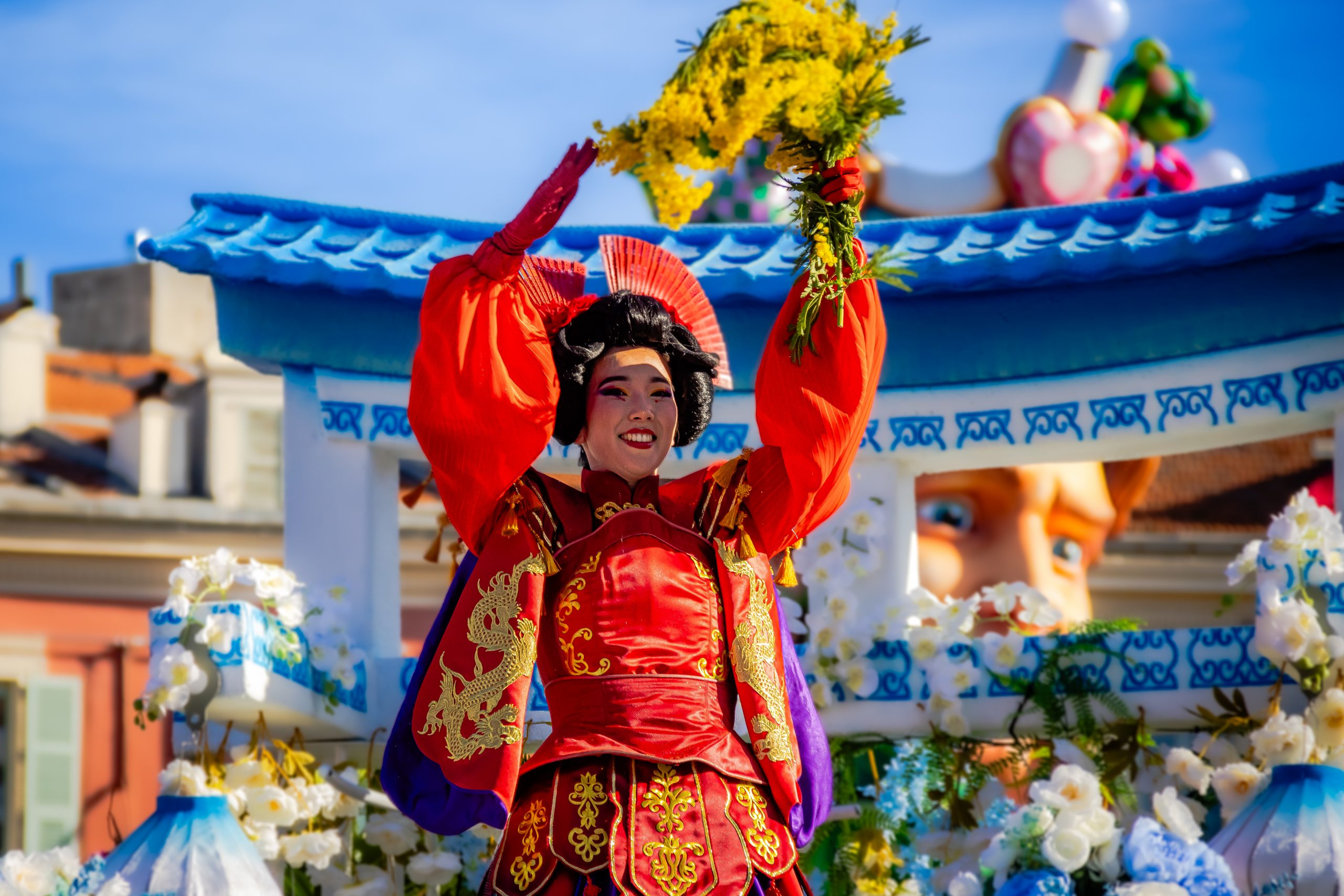 14 comédiennes distribuent au public plus de 4 tonnes de mimosas par sortie, en plus des fleurs décorant les chars.