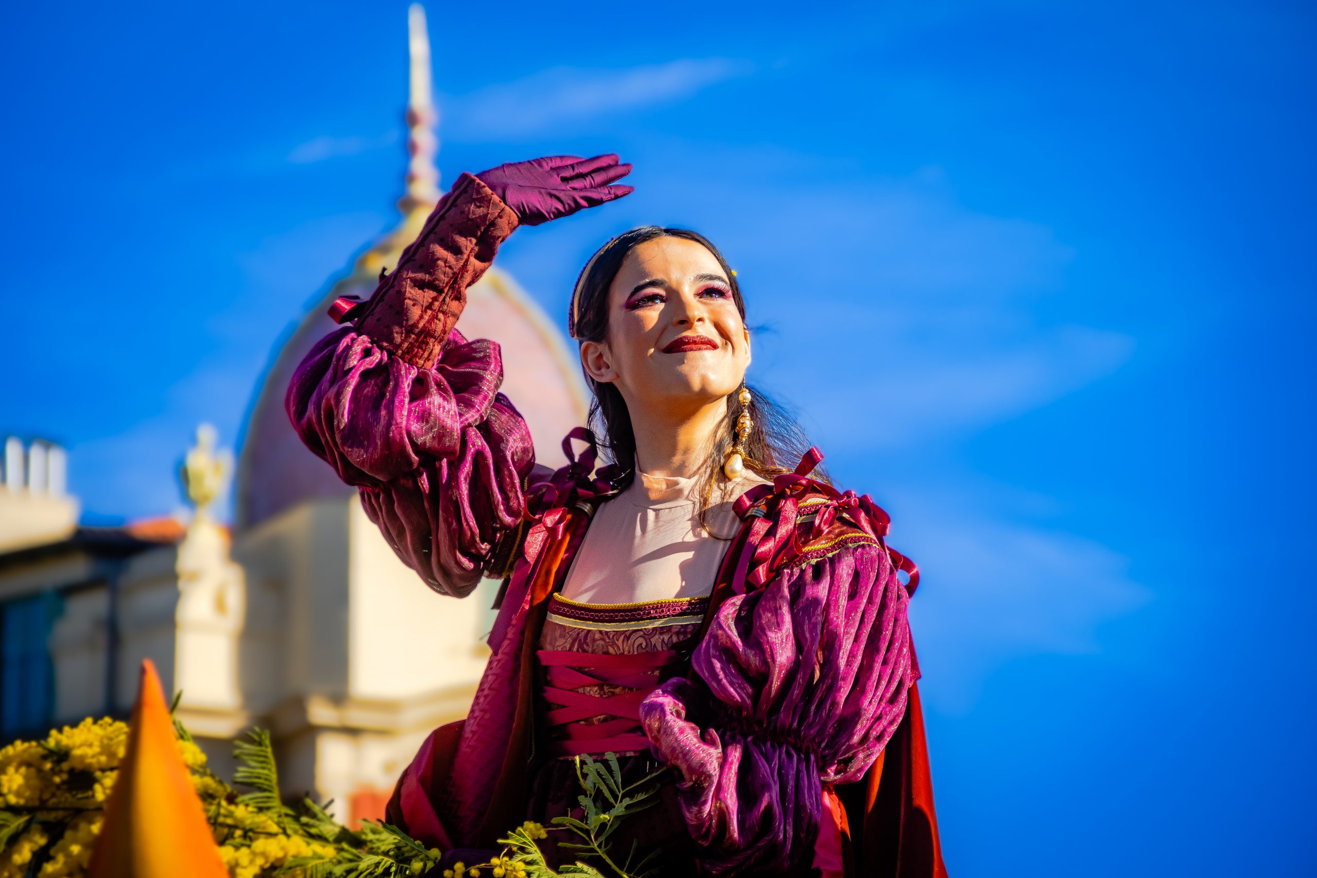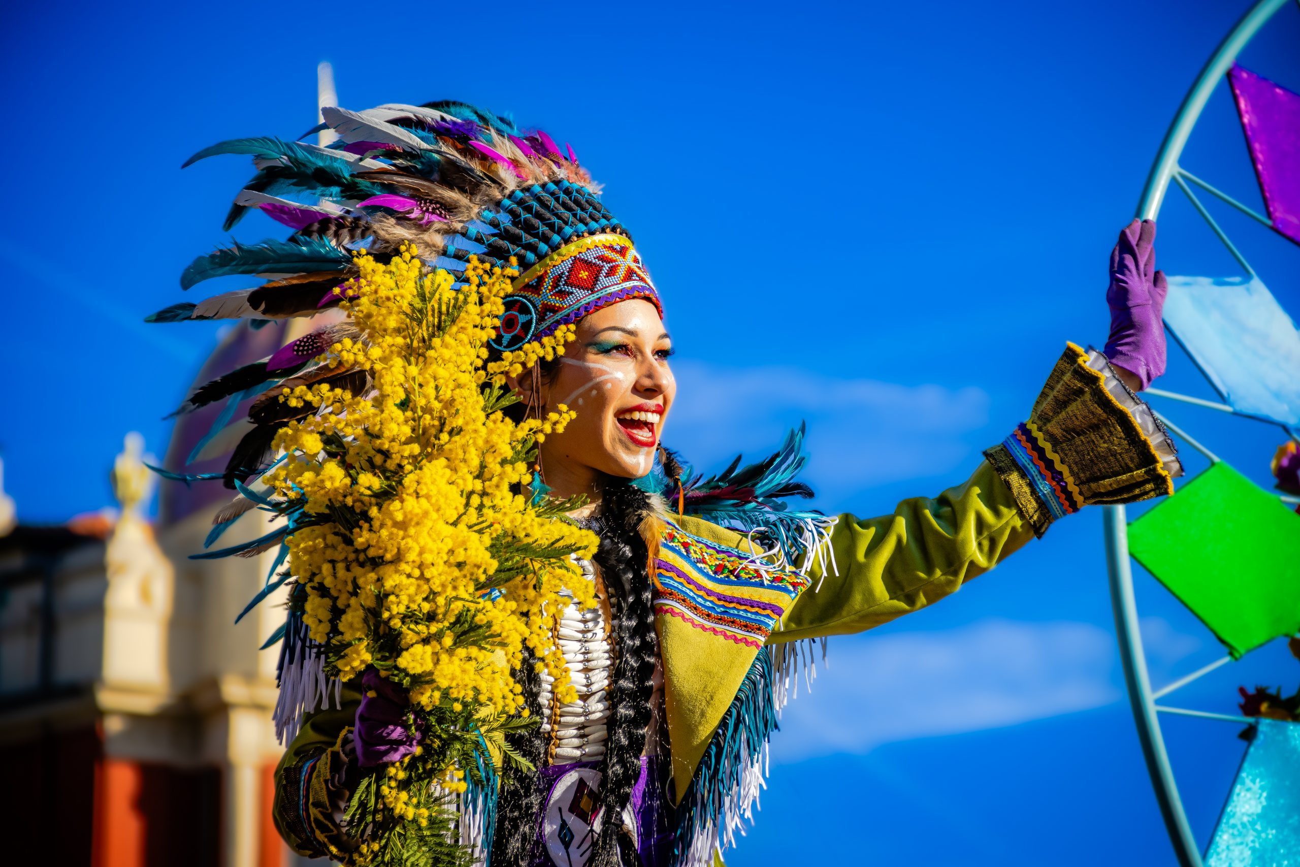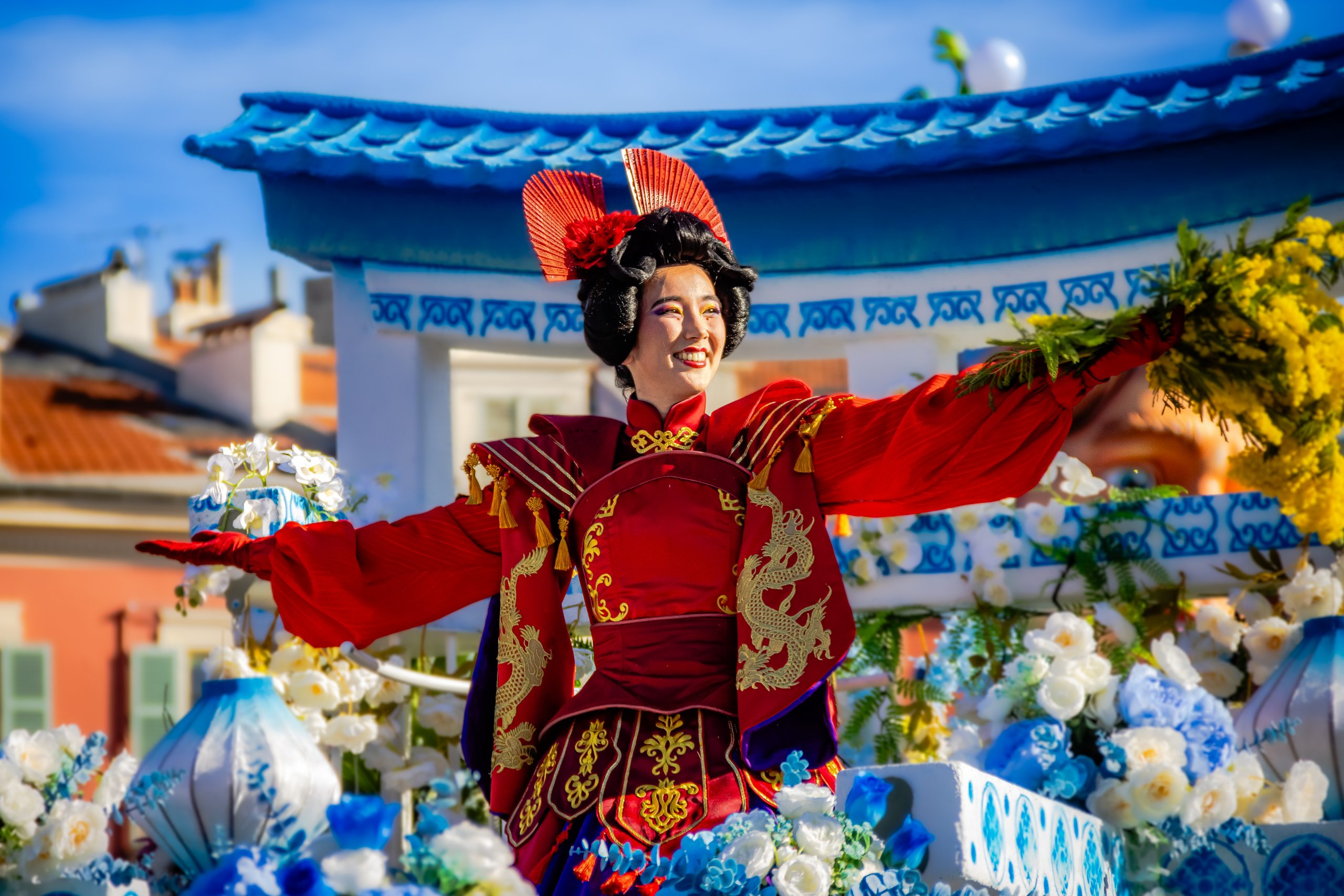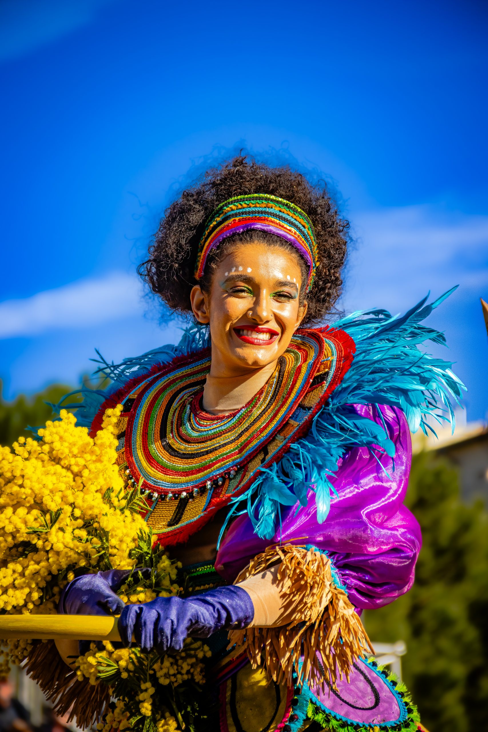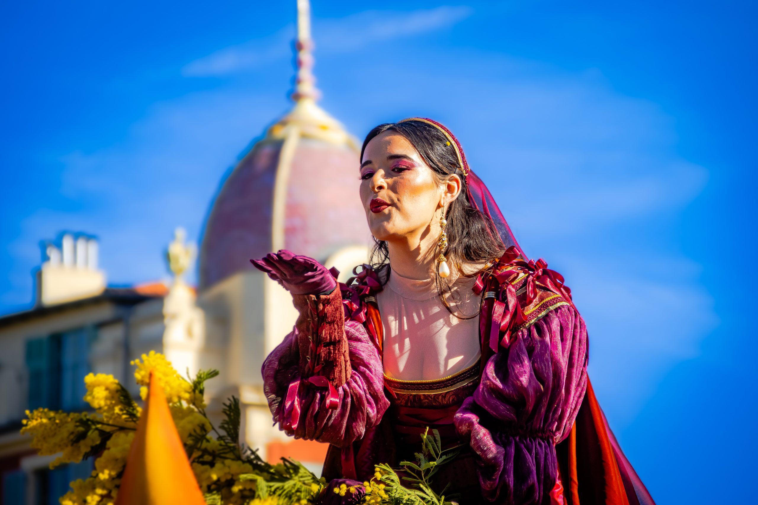 14 comédiennes distribuent au public plus de 4 tonnes de mimosas par sortie, en plus des fleurs décorant les chars.