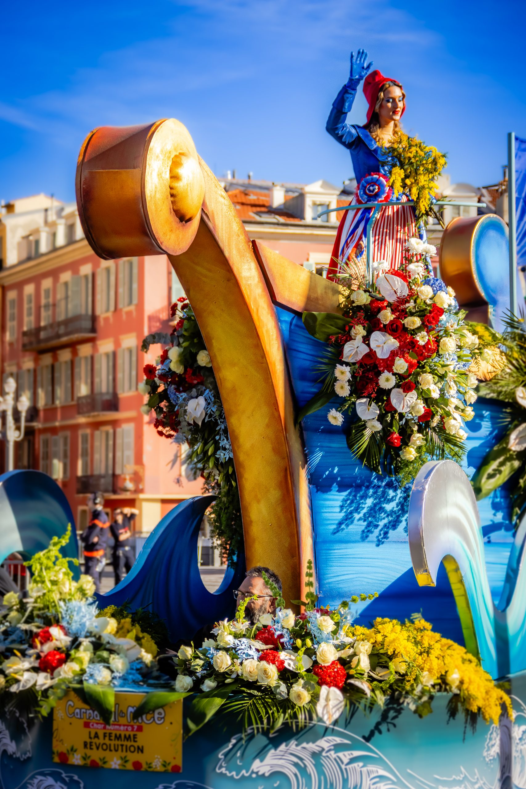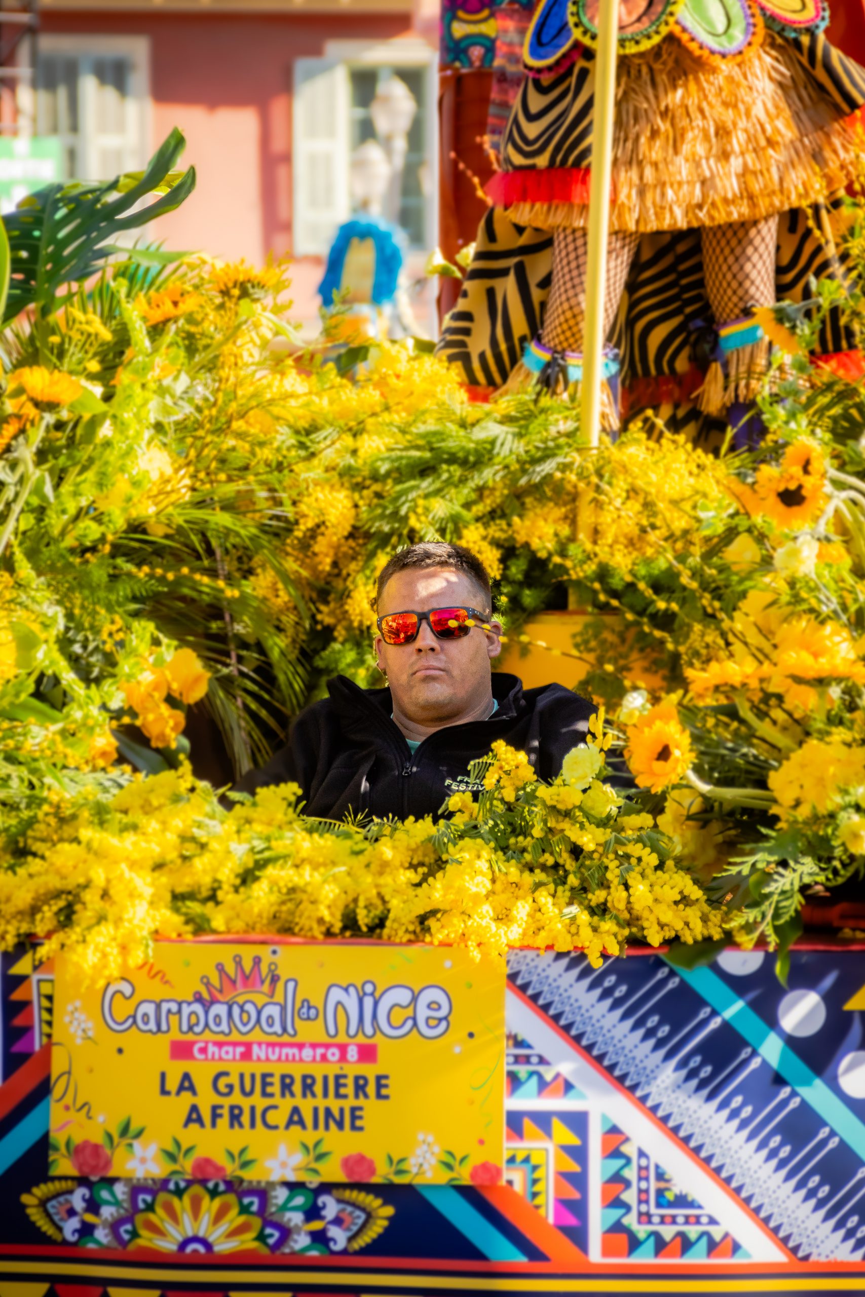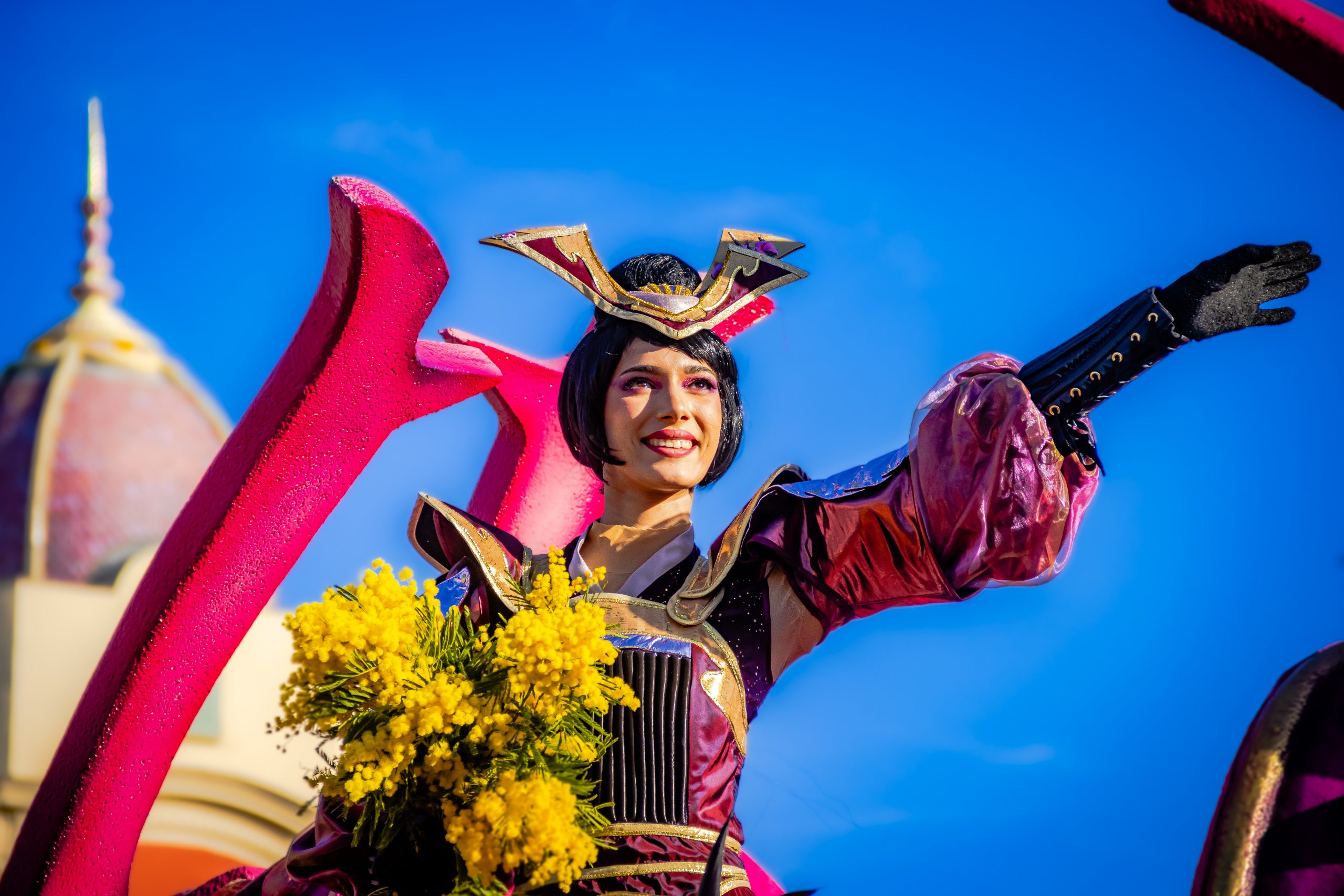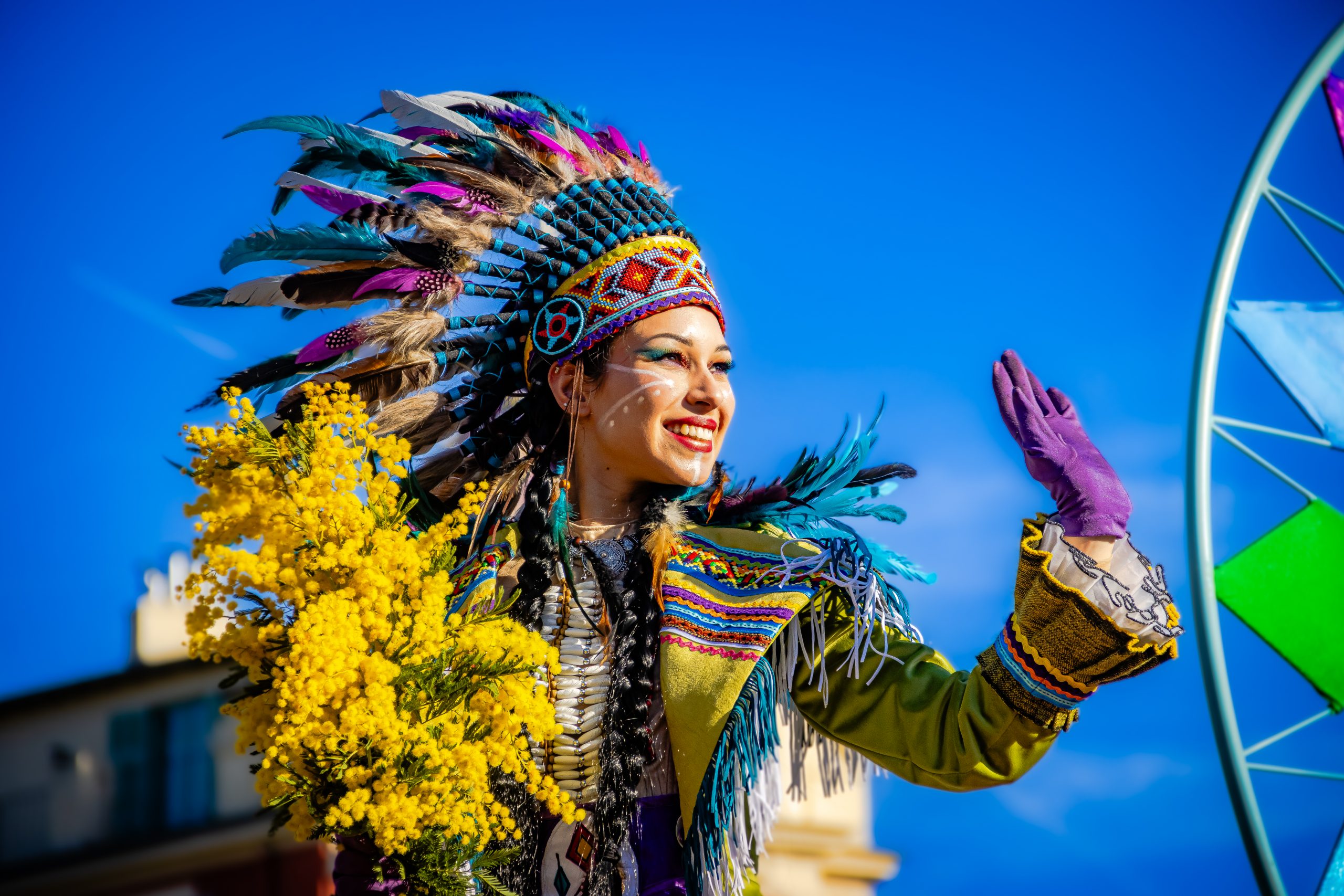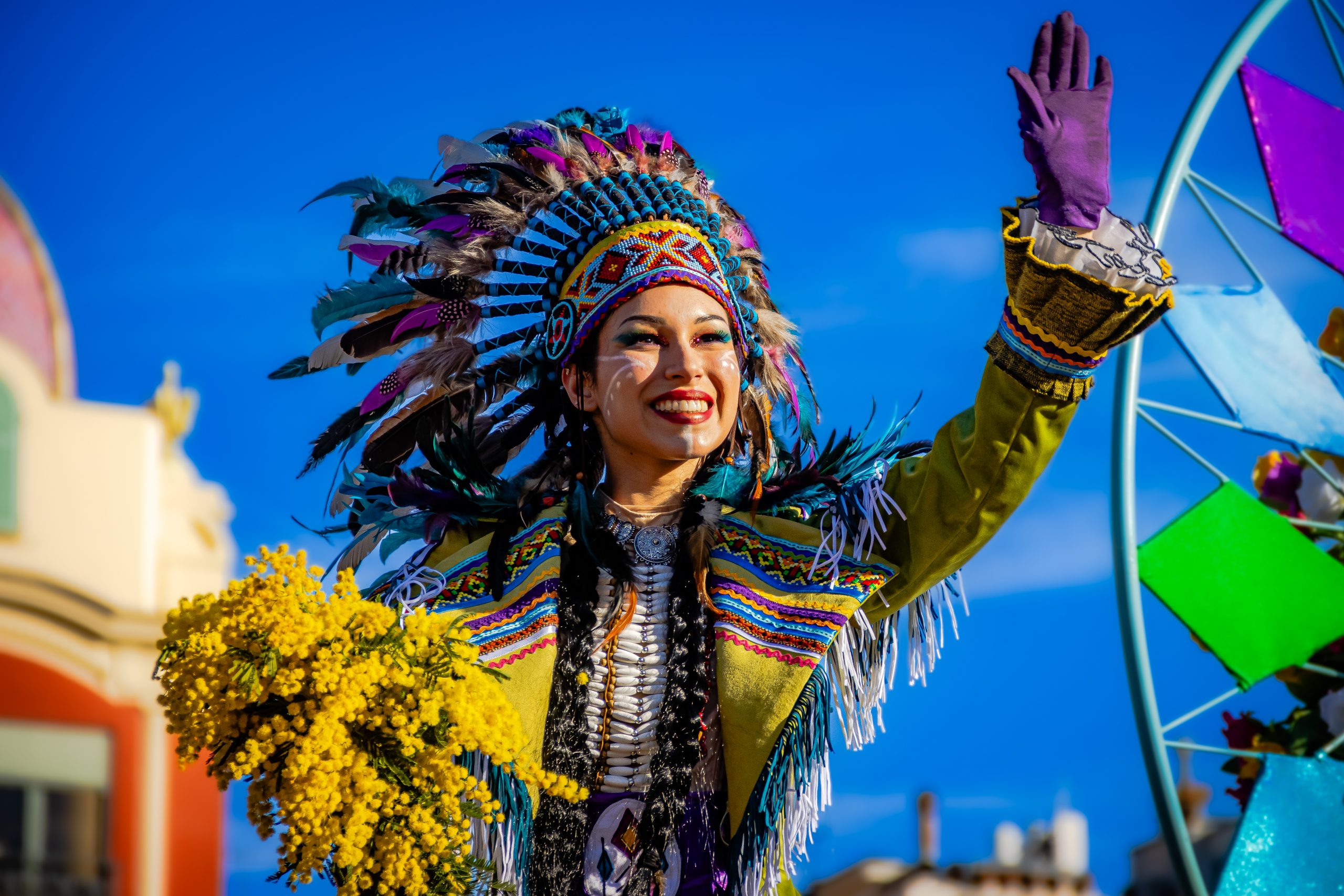 14 comédiennes distribuent au public plus de 4 tonnes de mimosas par sortie, en plus des fleurs décorant les chars.