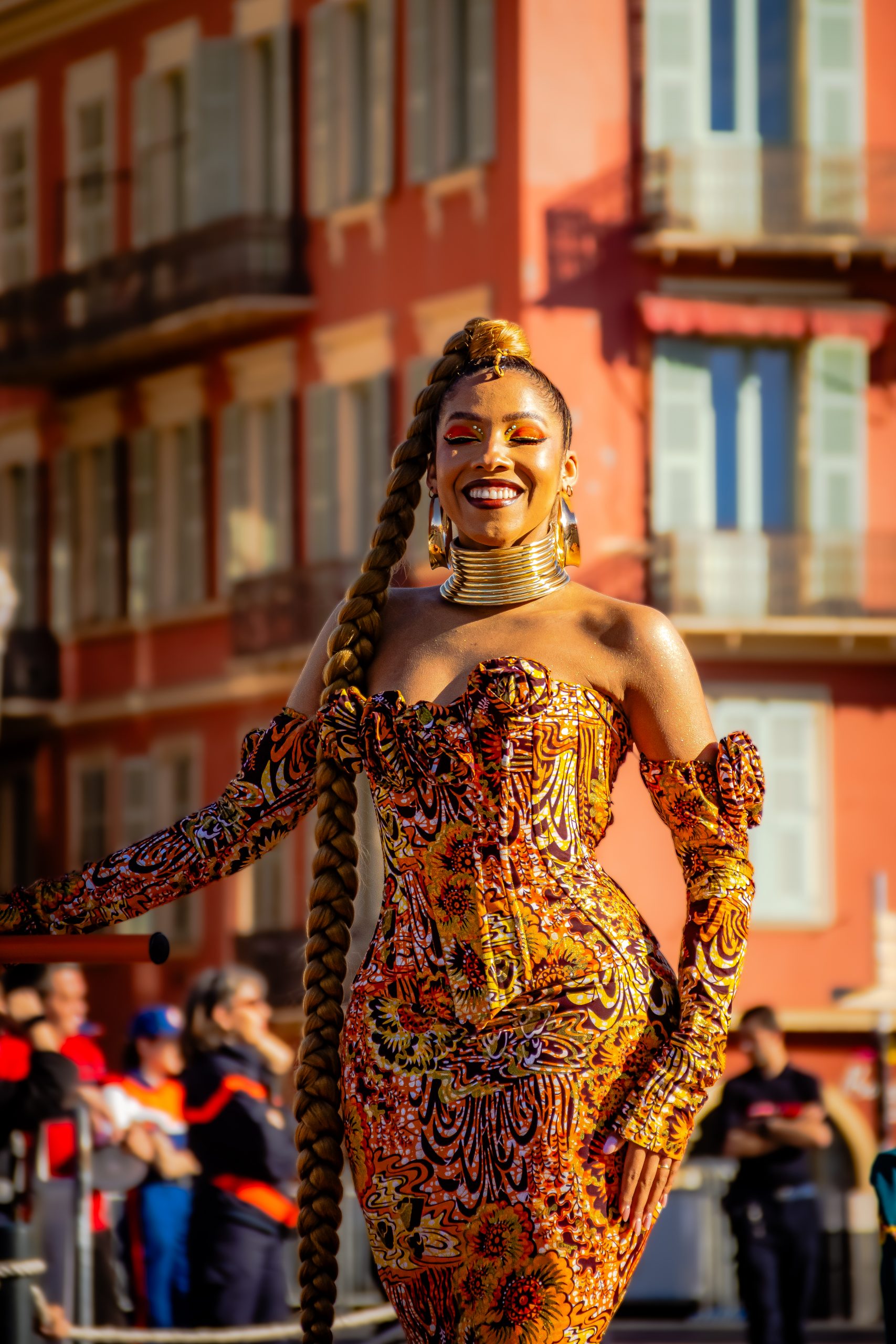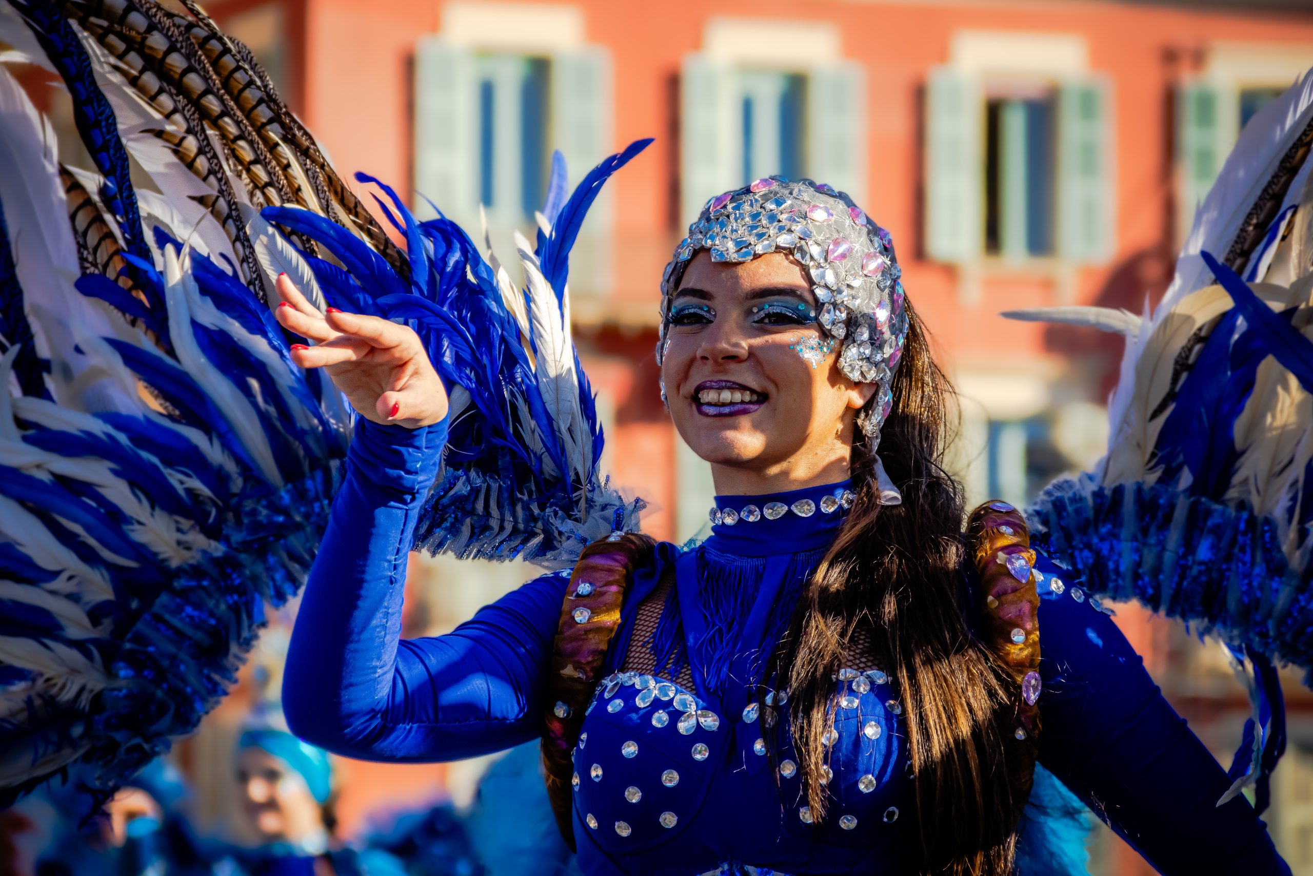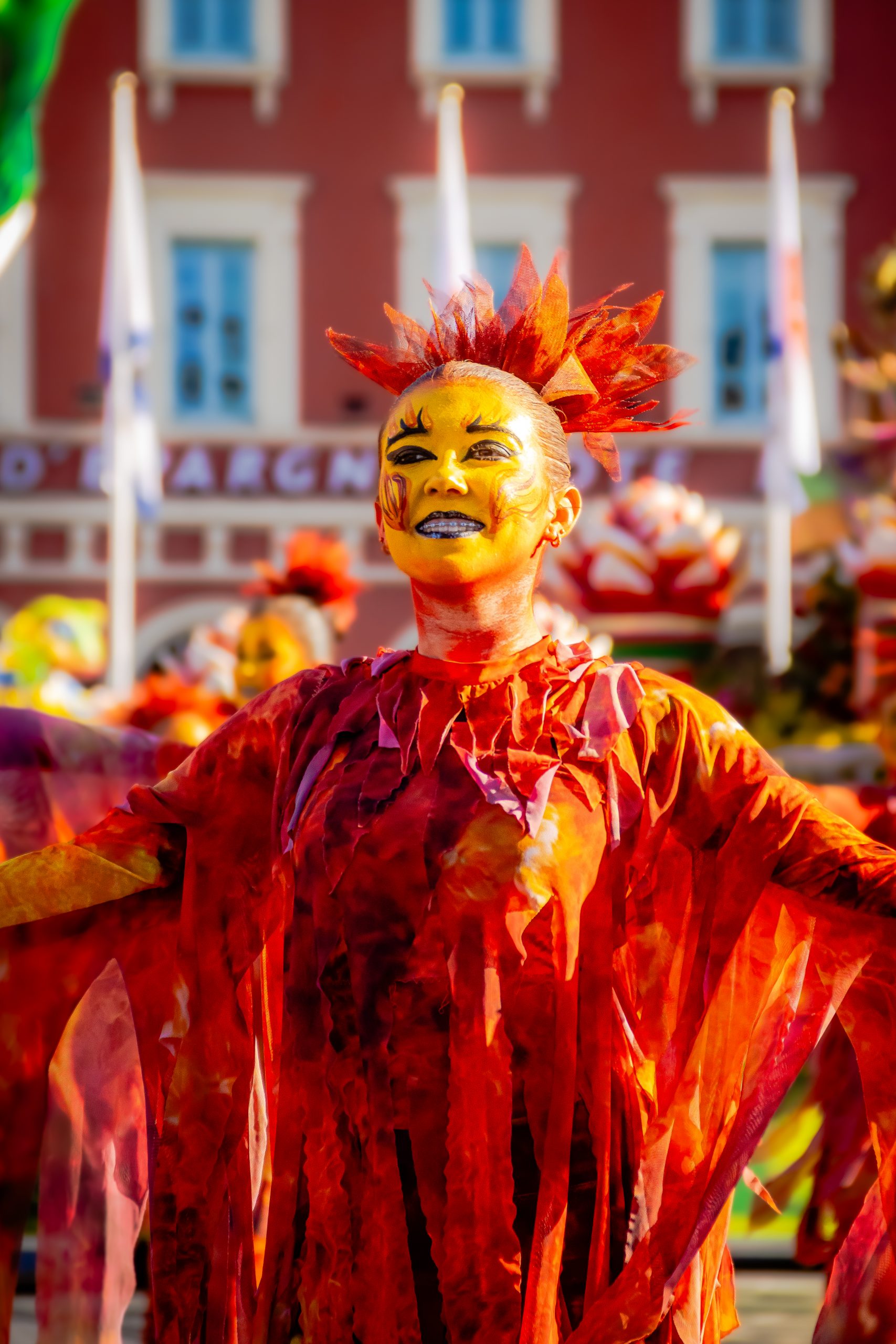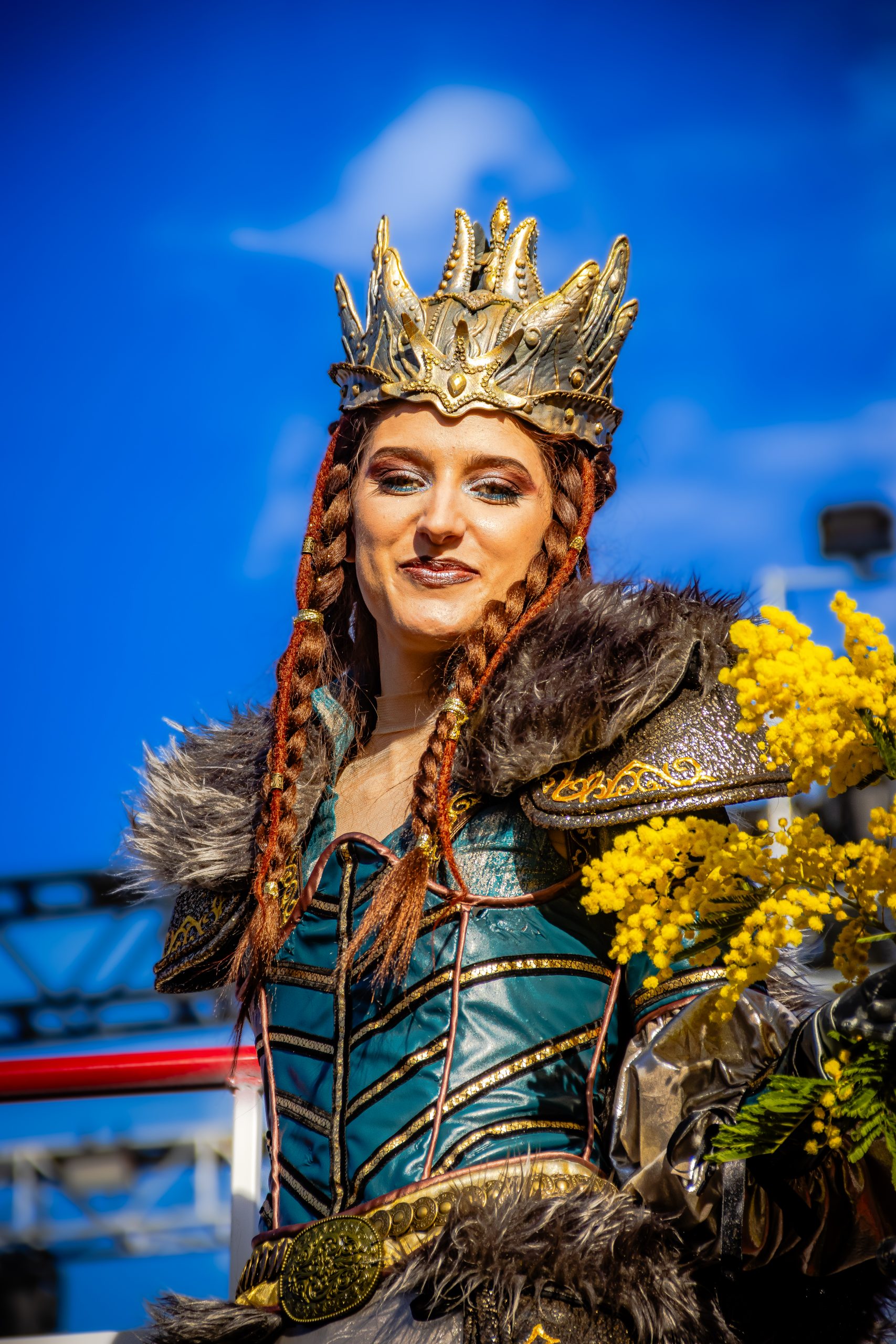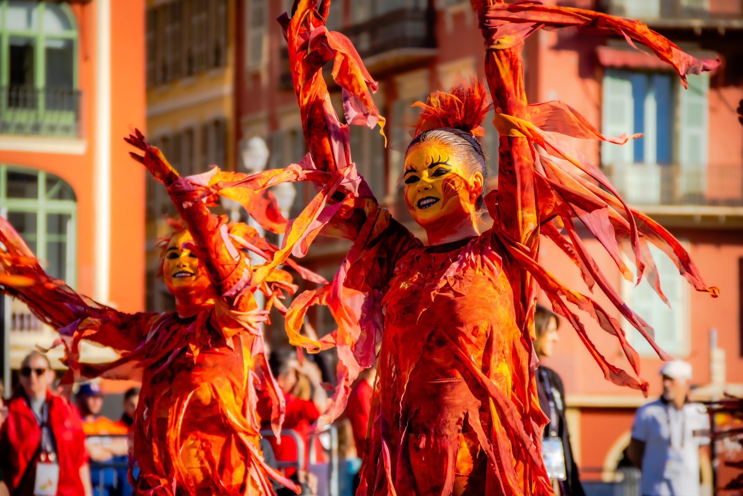 14 comédiennes distribuent au public plus de 4 tonnes de mimosas par sortie, en plus des fleurs décorant les chars.