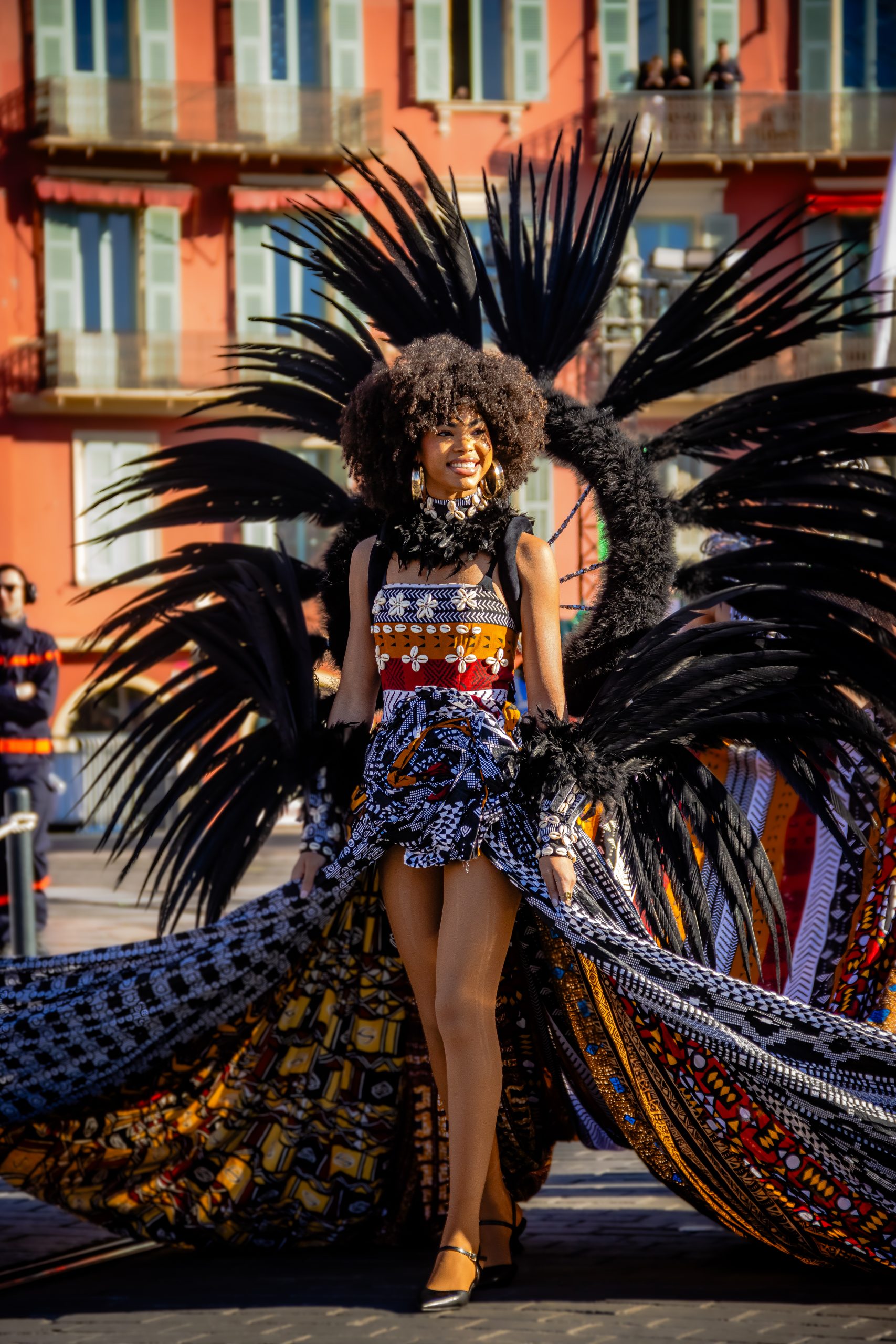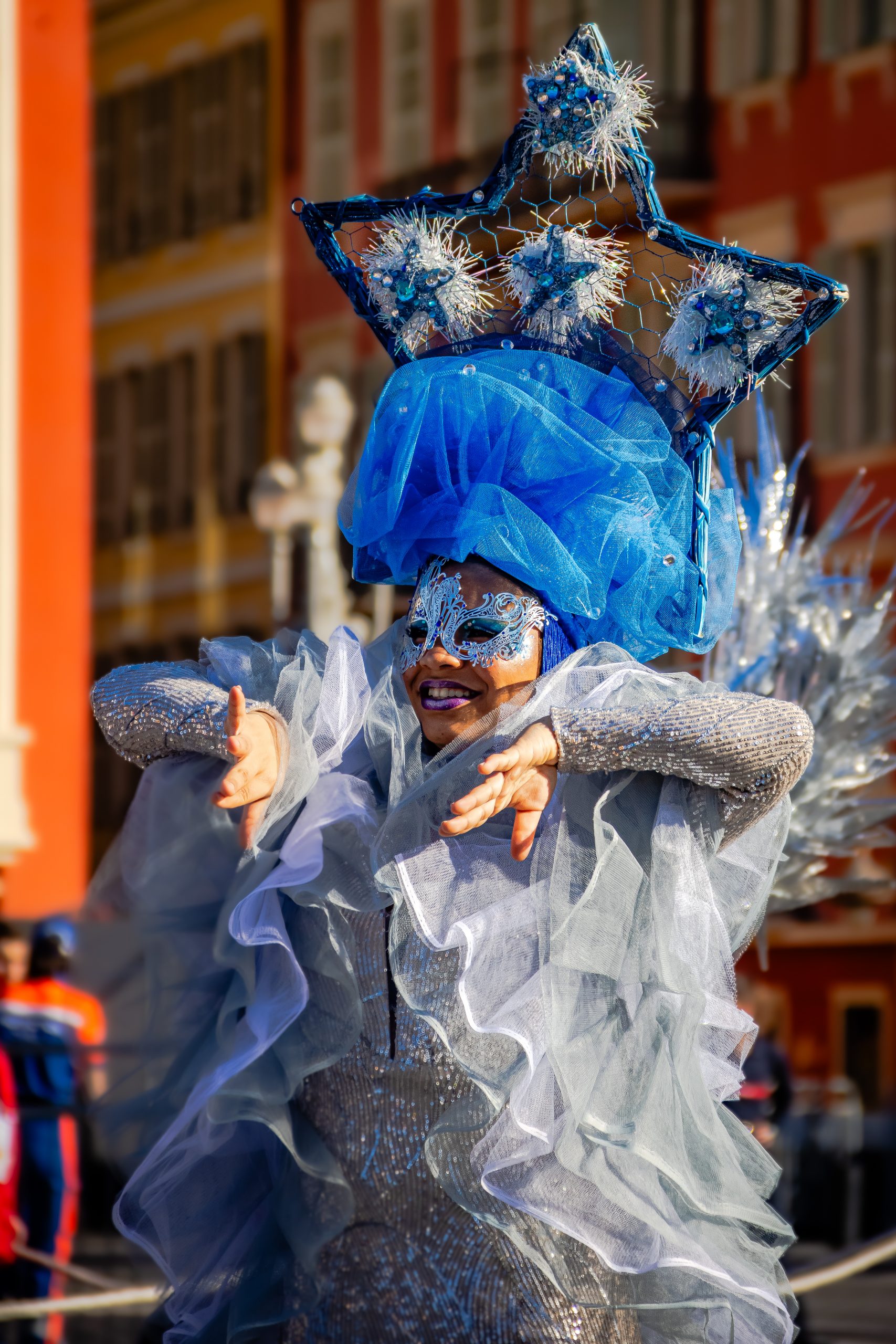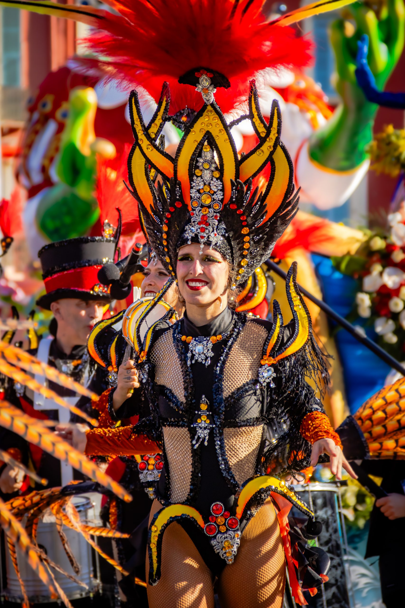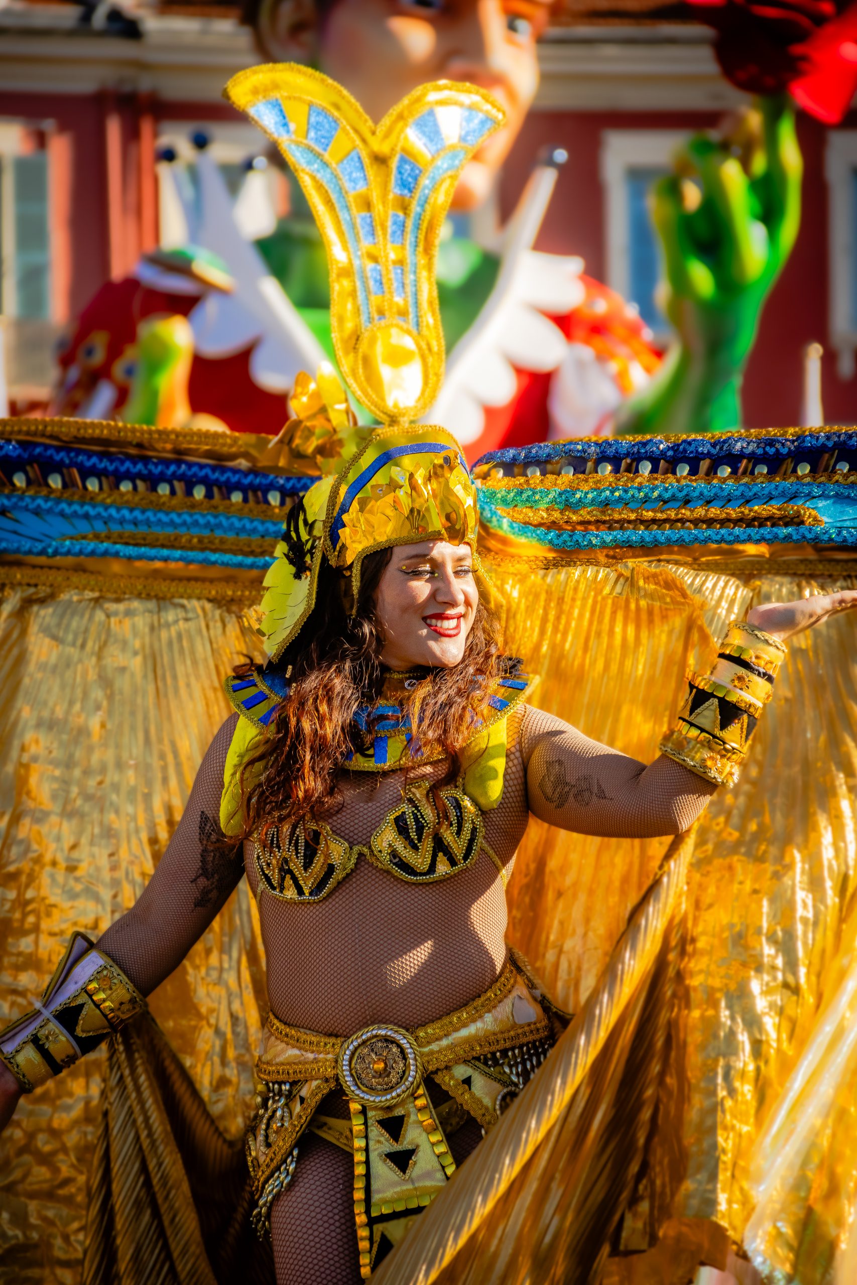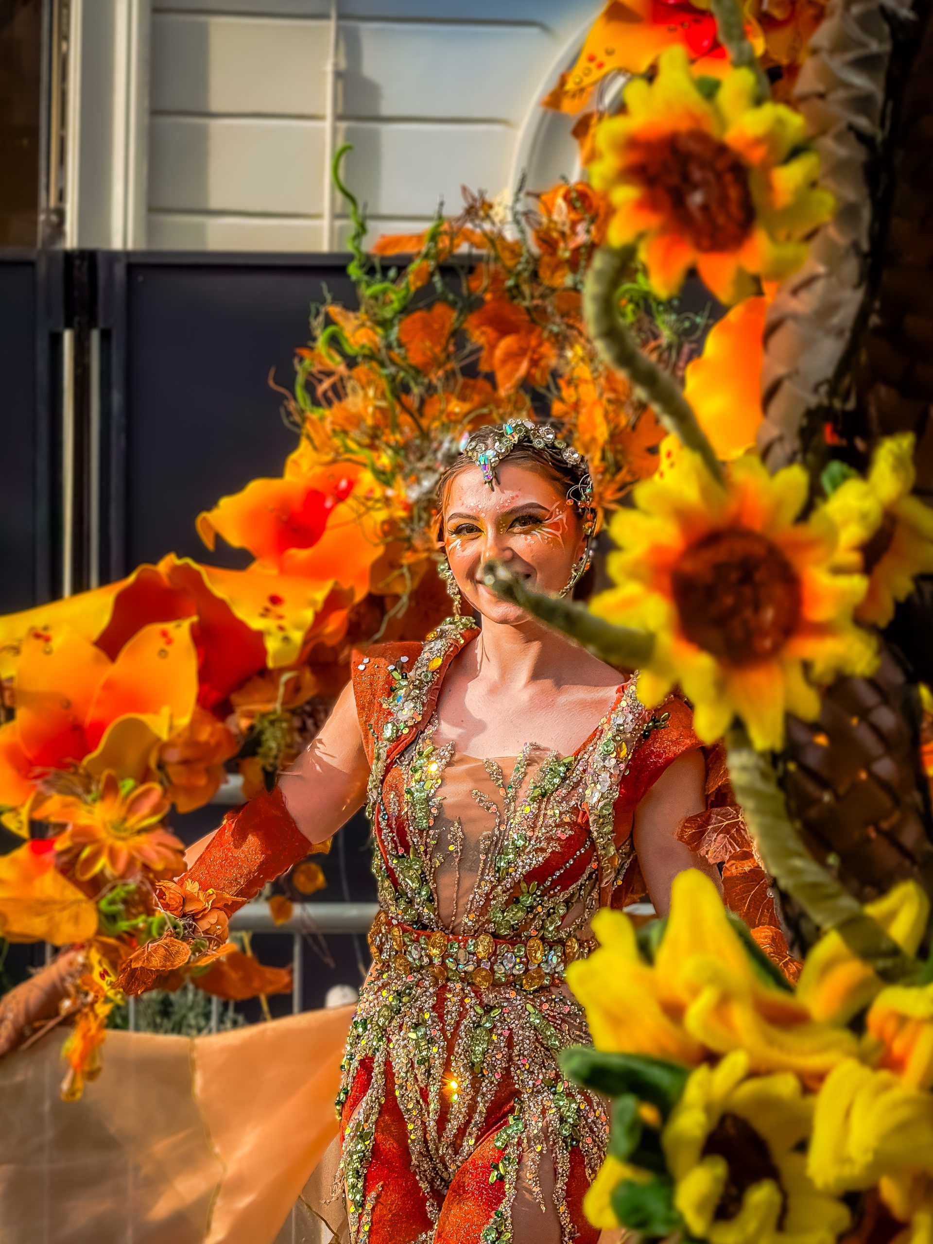 14 comédiennes distribuent au public plus de 4 tonnes de mimosas par sortie, en plus des fleurs décorant les chars.