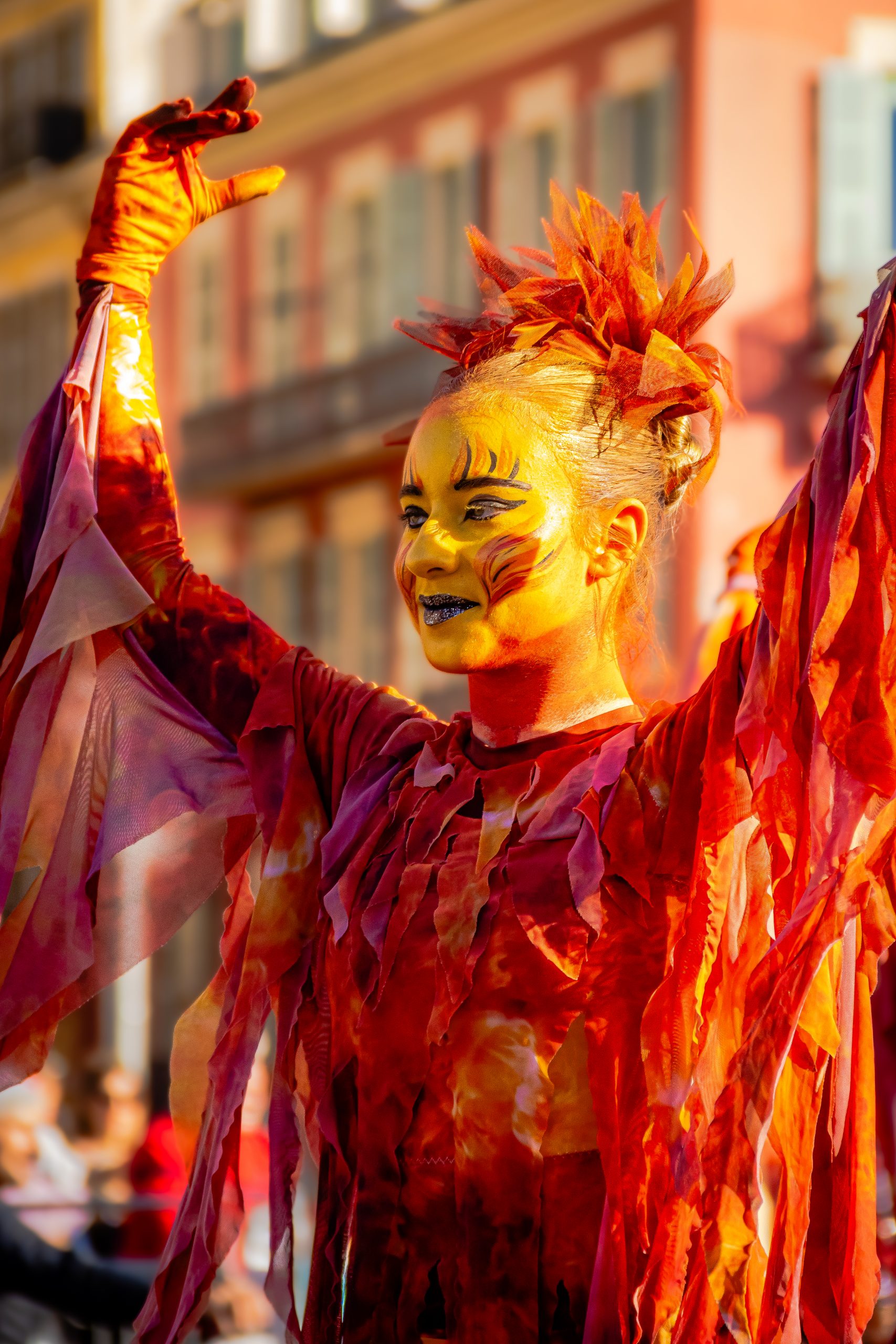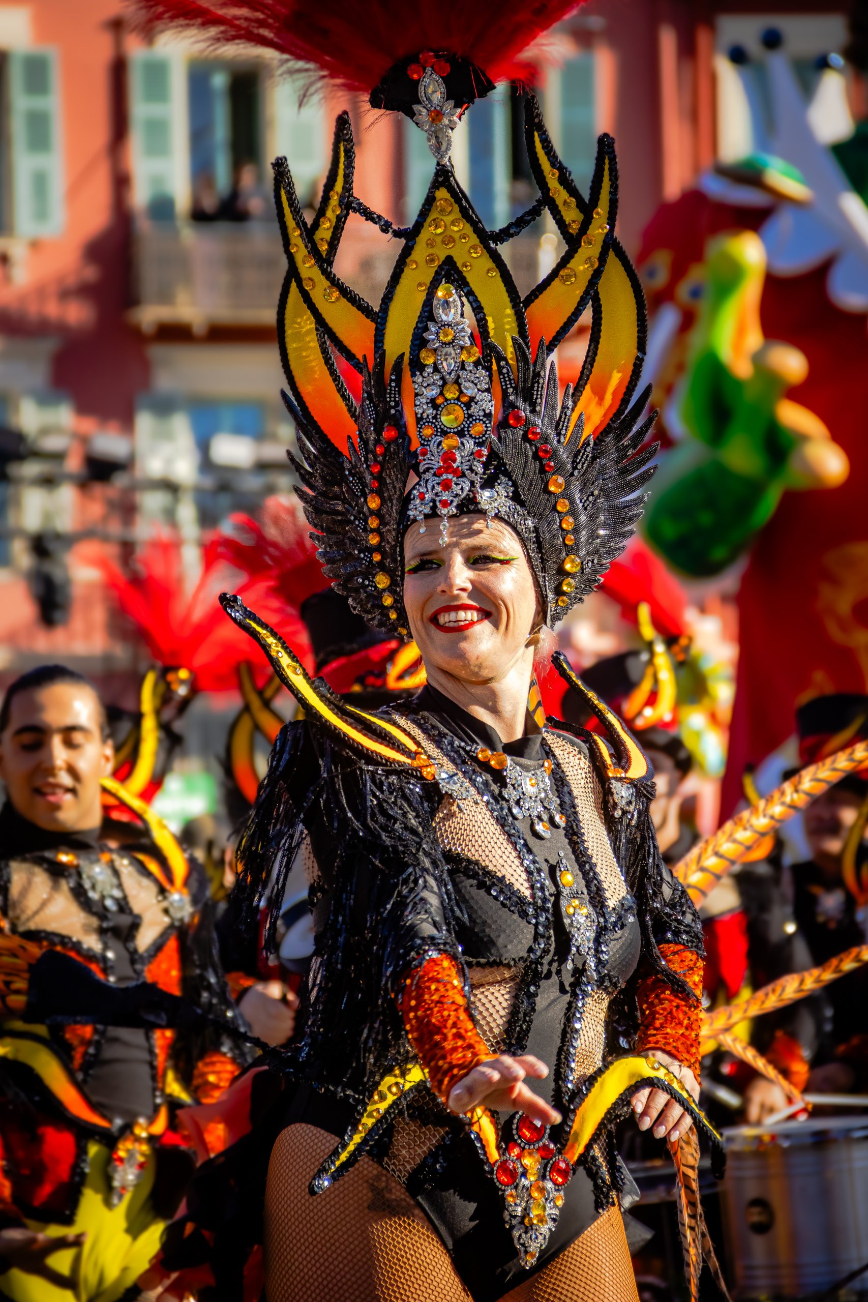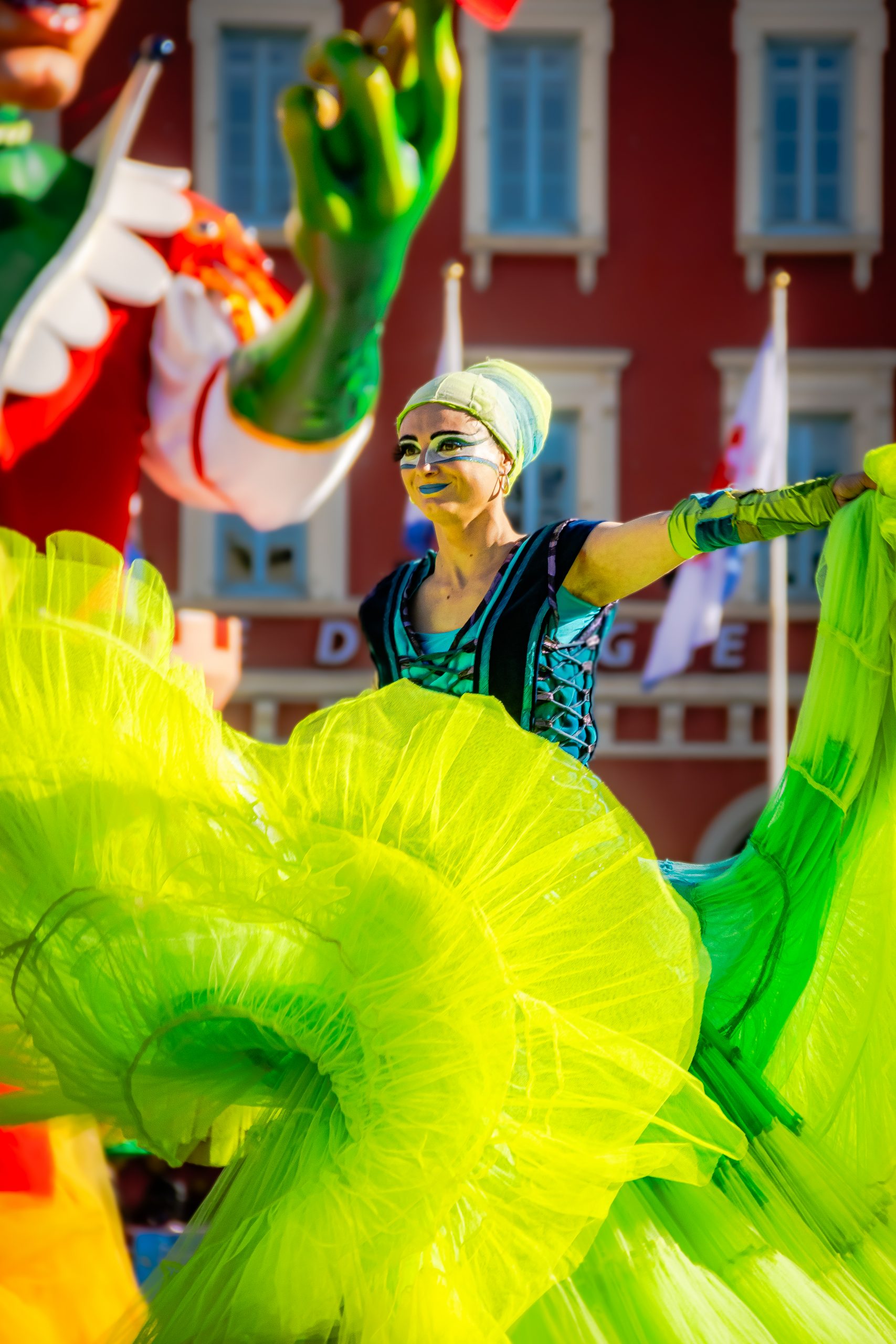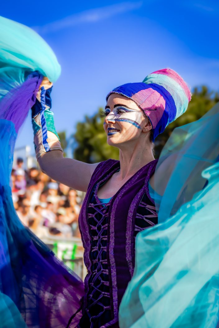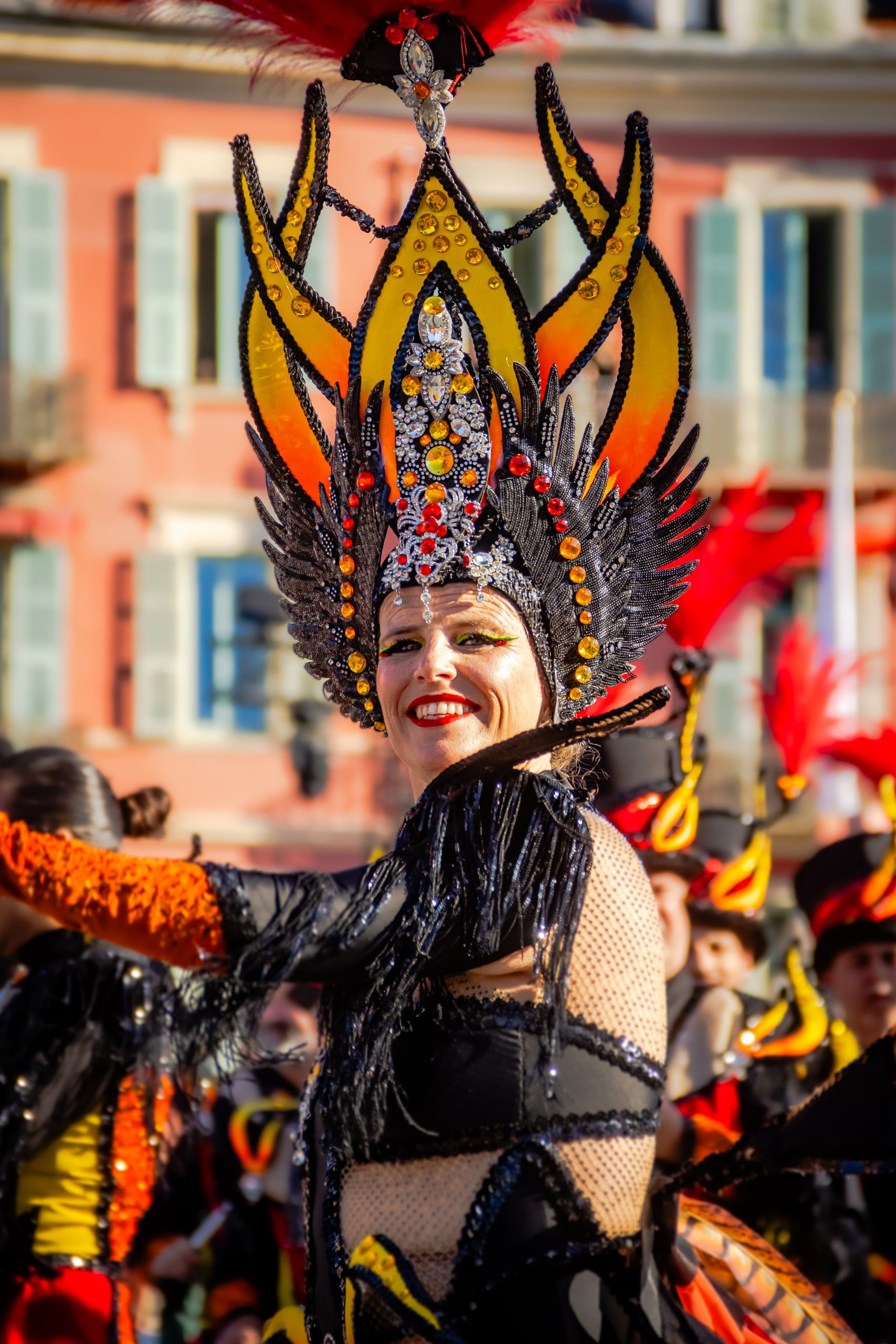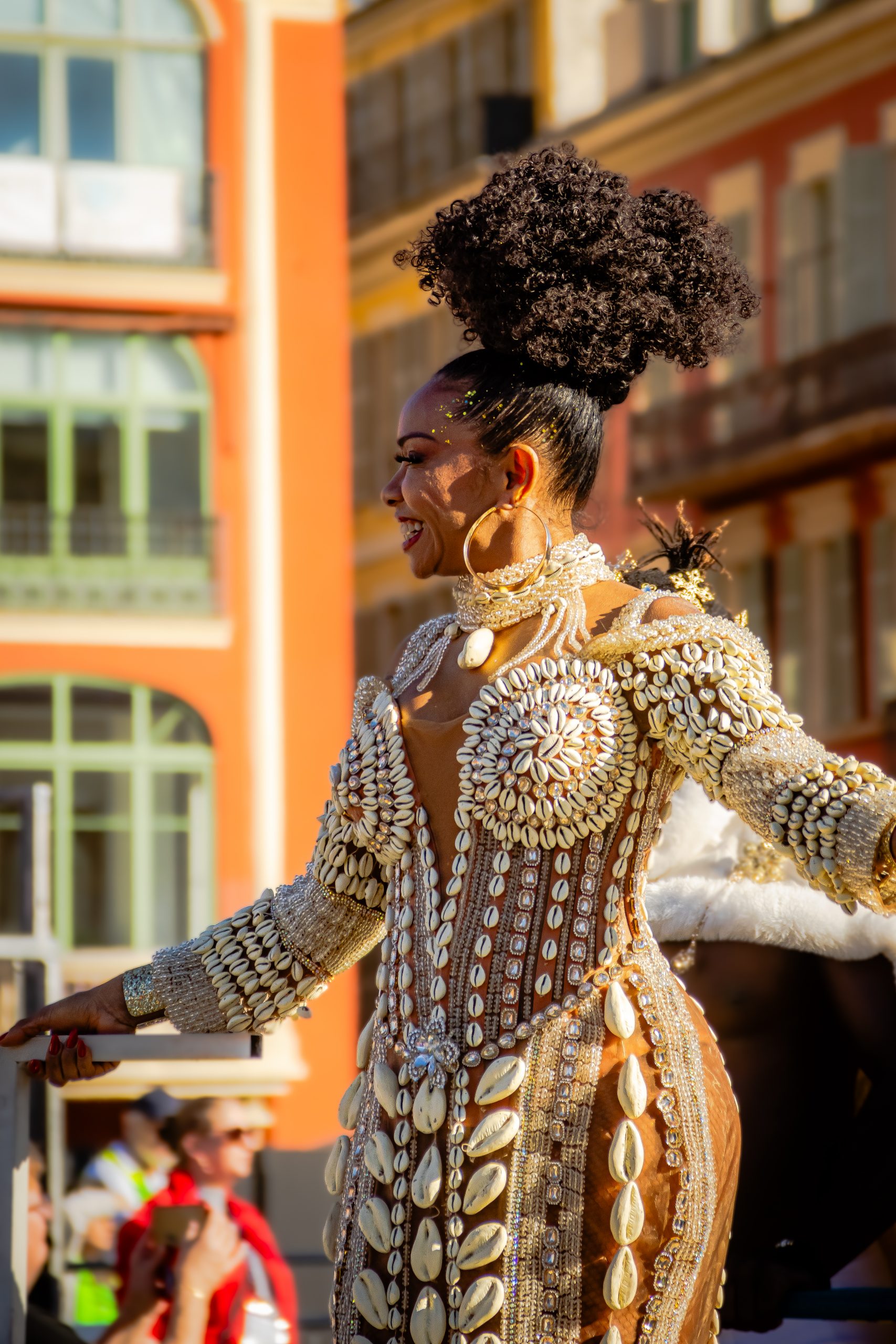 14 comédiennes distribuent au public plus de 4 tonnes de mimosas par sortie, en plus des fleurs décorant les chars.
