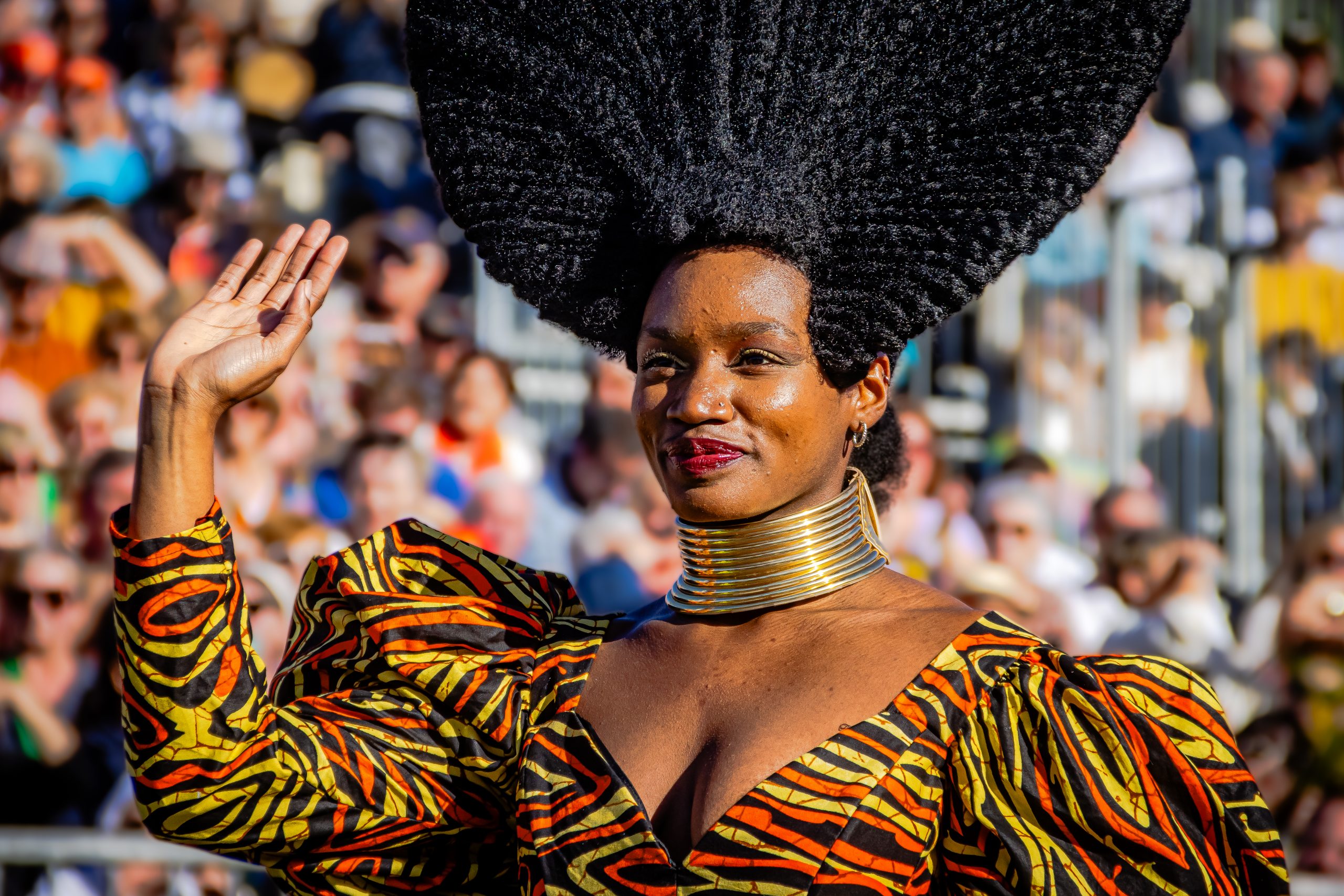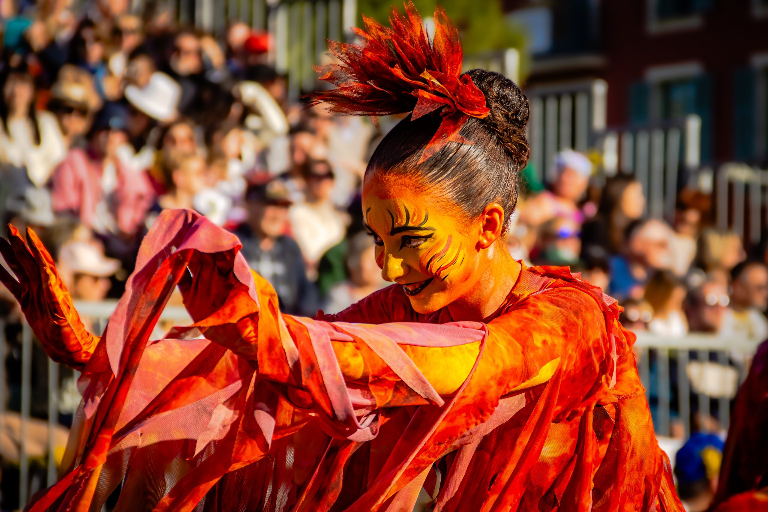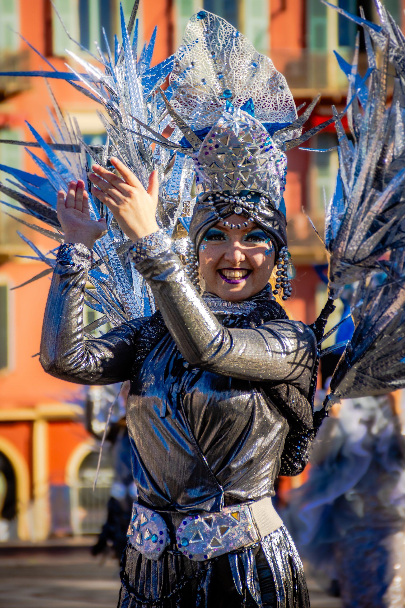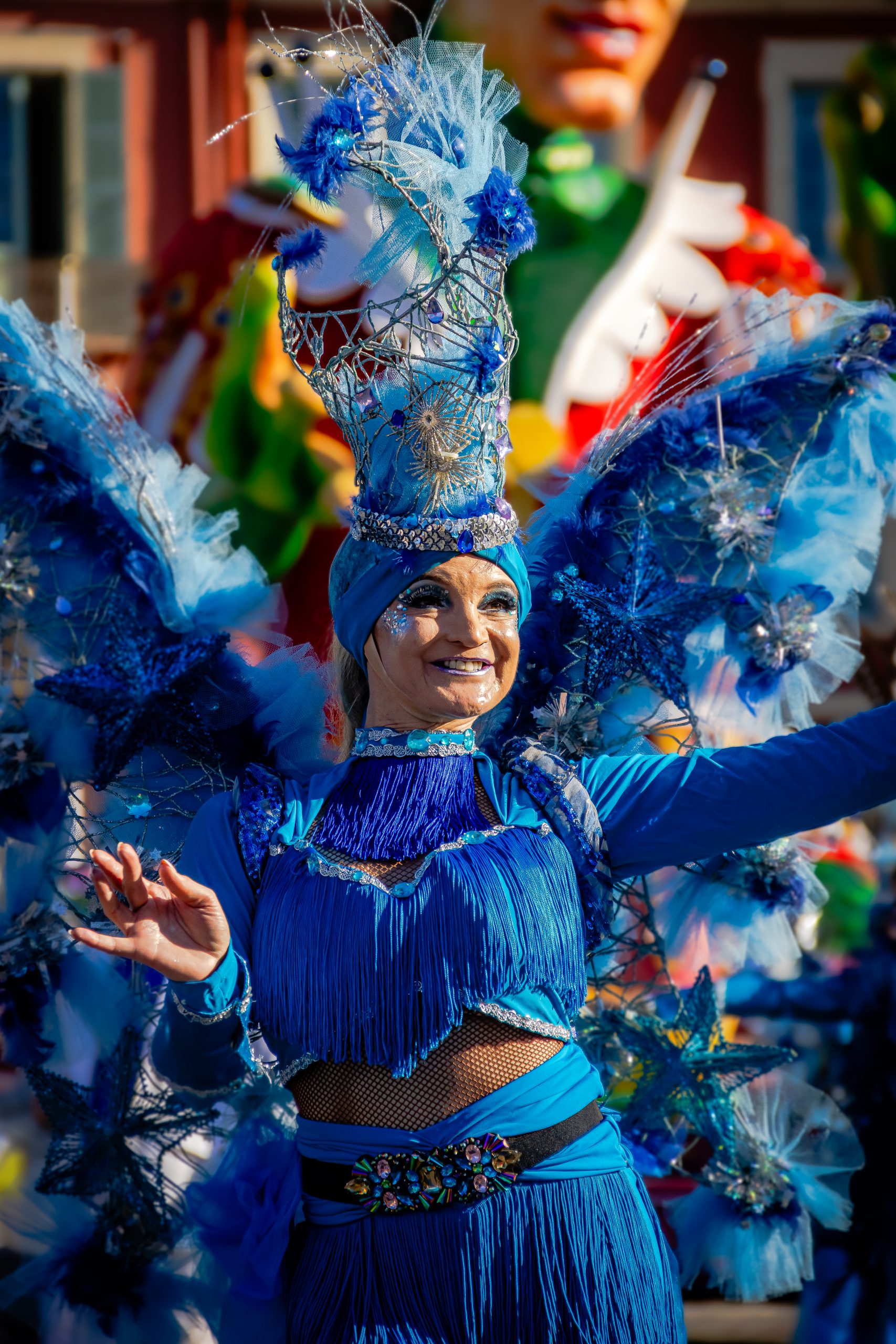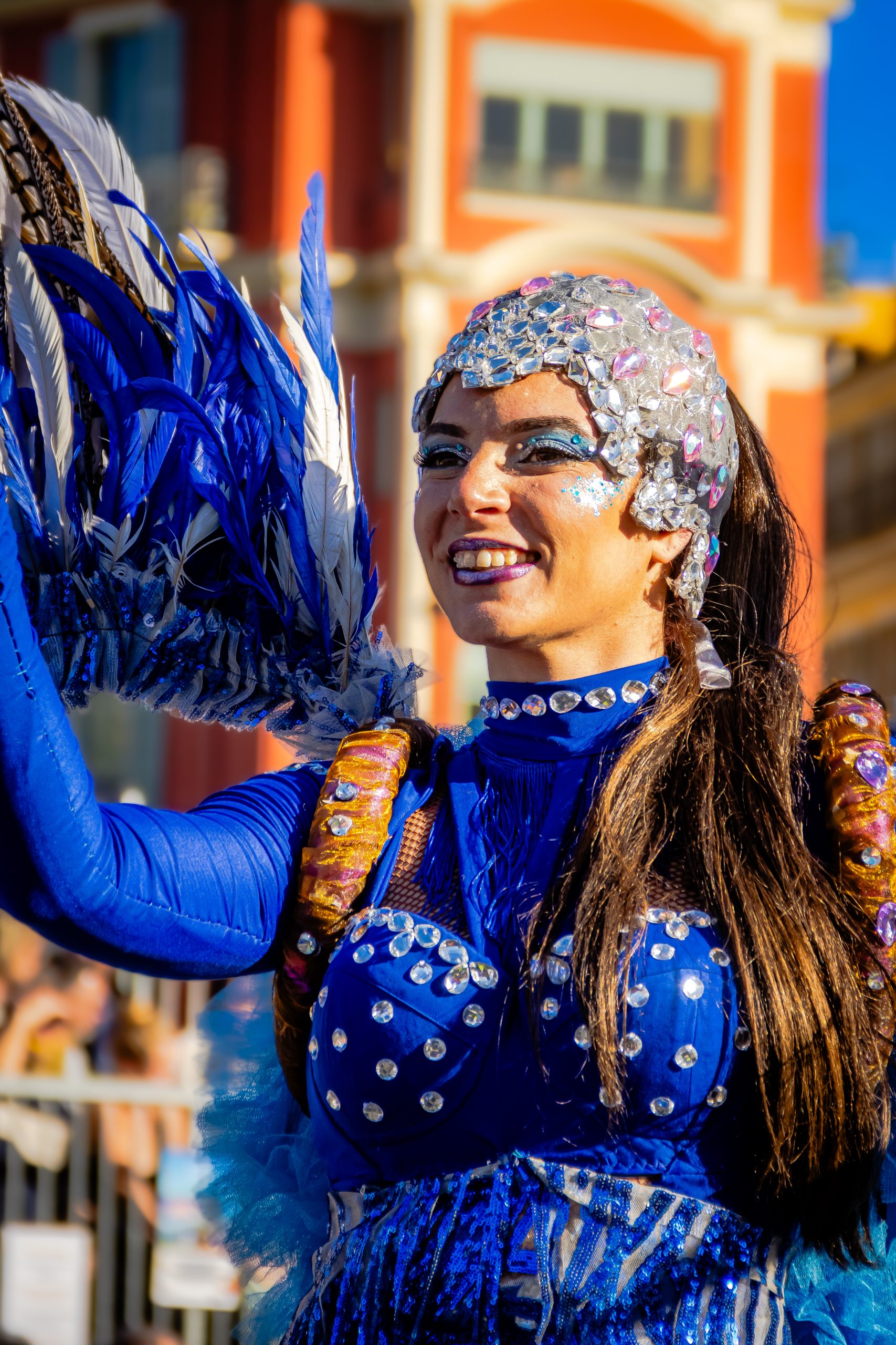 14 comédiennes distribuent au public plus de 4 tonnes de mimosas par sortie, en plus des fleurs décorant les chars.